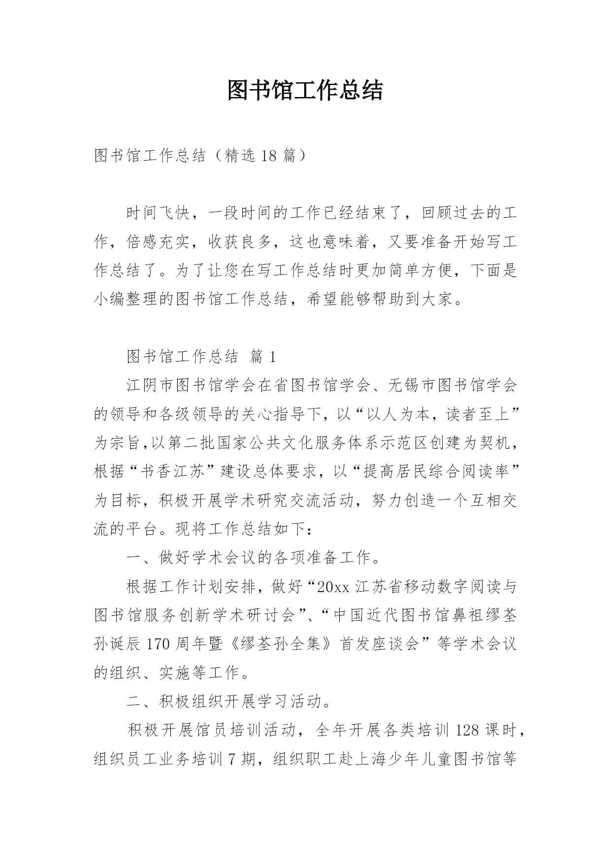 图书馆工作总结图书馆工作总结(精选18篇)时间飞快,一段时间的工作已经结束了,回顾过去的工作,倍感充实,收获良多,这也意味着,又要准备开始写工作总结了。为了让您在写工作总结时更加简单方便,下面是小编整理的图书馆工作总结,希望能够帮助到大家。图书馆工作总结篇1江阴市图书馆学会在省图书馆学会、无锡市图书馆学会的领导和各级领导的关心指导下,以“以人为本,读者至上”为宗旨,以第二批国家公共文化服务体系示范区创建为契机,根据“书香江苏”建设总体要求,以“提高居民综合阅读率”为目标,积极开展学术研究交流活动,努力创造