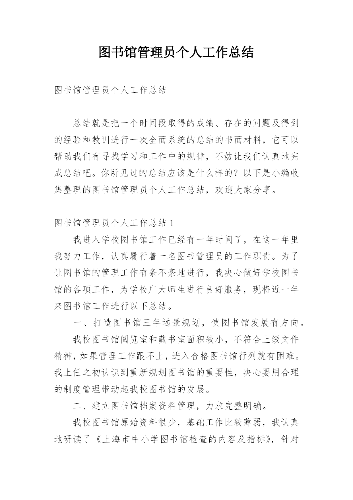 图书馆管理员个人工作总结图书馆管理员个人工作总结总结就是把一个时间段取得的成绩、存在的问题及得到的经验和教训进行一次全面系统的总结的书面材料,它可以帮助我们有寻找学习和工作中的规律,不妨让我们认真地完成总结吧。你所见过的总结应该是什么样的?以下是小编收集整理的图书馆管理员个人工作总结,欢迎大家分享。图书馆管理员个人工作总结1我进入学校图书馆工作已经有一年时间了,在这一年里我努力工作,认真履行着一名图书管理员的工作职责。为了让图书馆的管理工作有条不紊地进行,我决心做好学校图书馆的各项工作,为学校广大师生进行