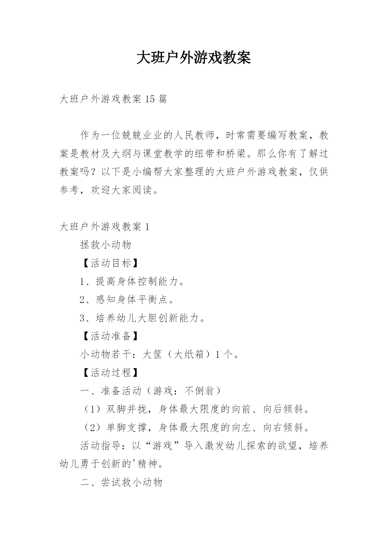 大班户外游戏教案大班户外游戏教案15篇作为一位兢兢业业的人民教师,时常需要编写教案,教案是教材及大纲与课堂教学的纽带和桥梁。那么你有了解过教案吗?以下是小编帮大家整理的大班户外游戏教案,仅供参考,欢迎大家阅读。大班户外游戏教案1拯救小动物【活动目标】1、提高身体控制能力。2、感知身体平衡点。3、培养幼儿大胆创新能力。【活动准备】小动物若干:大筐(大纸箱)1个。【活动过程】一、准备活动(游戏:不倒翁)(1)双脚并拢,身体最大限度的向前、向后倾斜。(2)单脚支撑,身体最大限度的向左、向右倾斜。活动指导:以“游
