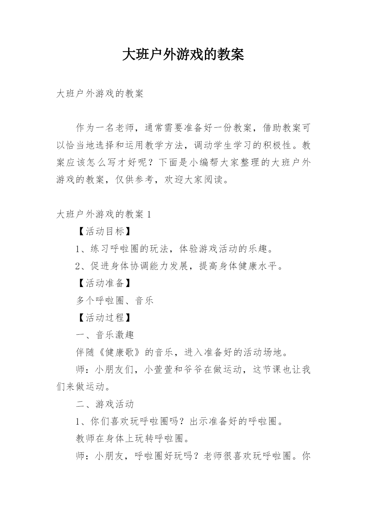 大班户外游戏的教案大班户外游戏的教案作为一名老师,通常需要准备好一份教案,借助教案可以恰当地选择和运用教学方法,调动学生学习的积极性。教案应该怎么写才好呢?下面是小编帮大家整理的大班户外游戏的教案,仅供参考,欢迎大家阅读。大班户外游戏的教案1【活动目标】1、练习呼啦圈的玩法,体验游戏活动的乐趣。2、促进身体协调能力发展,提高身体健康水平。【活动准备】多个呼啦圈、音乐【活动过程】一、音乐激趣伴随《健康歌》的音乐,进入准备好的活动场地。师:小朋友们,小萱萱和爷爷在做运动,这节课也让我们来做运动。二、游戏活动1