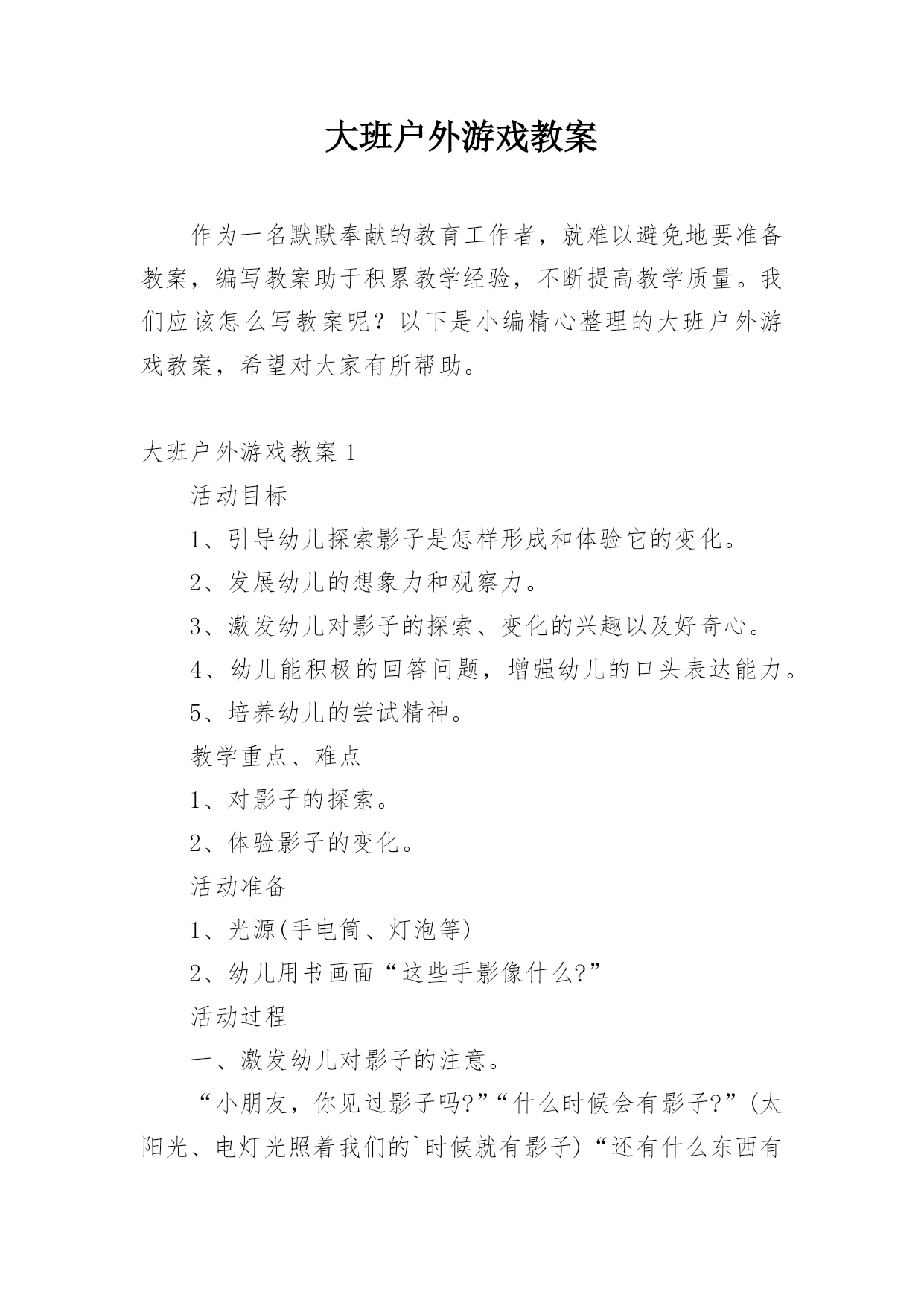 大班户外游戏教案作为一名默默奉献的教育工作者,就难以避免地要准备教案,编写教案助于积累教学经验,不断提高教学质量。我们应该怎么写教案呢?以下是小编精心整理的大班户外游戏教案,希望对大家有所帮助。大班户外游戏教案1活动目标1、引导幼儿探索影子是怎样形成和体验它的变化。2、发展幼儿的想象力和观察力。3、激发幼儿对影子的探索、变化的兴趣以及好奇心。4、幼儿能积极的回答问题,增强幼儿的口头表达能力。5、培养幼儿的尝试精神。教学重点、难点1、对影子的探索。2、体验影子的变化。活动准备1、光源(手电筒、灯泡等)2、幼