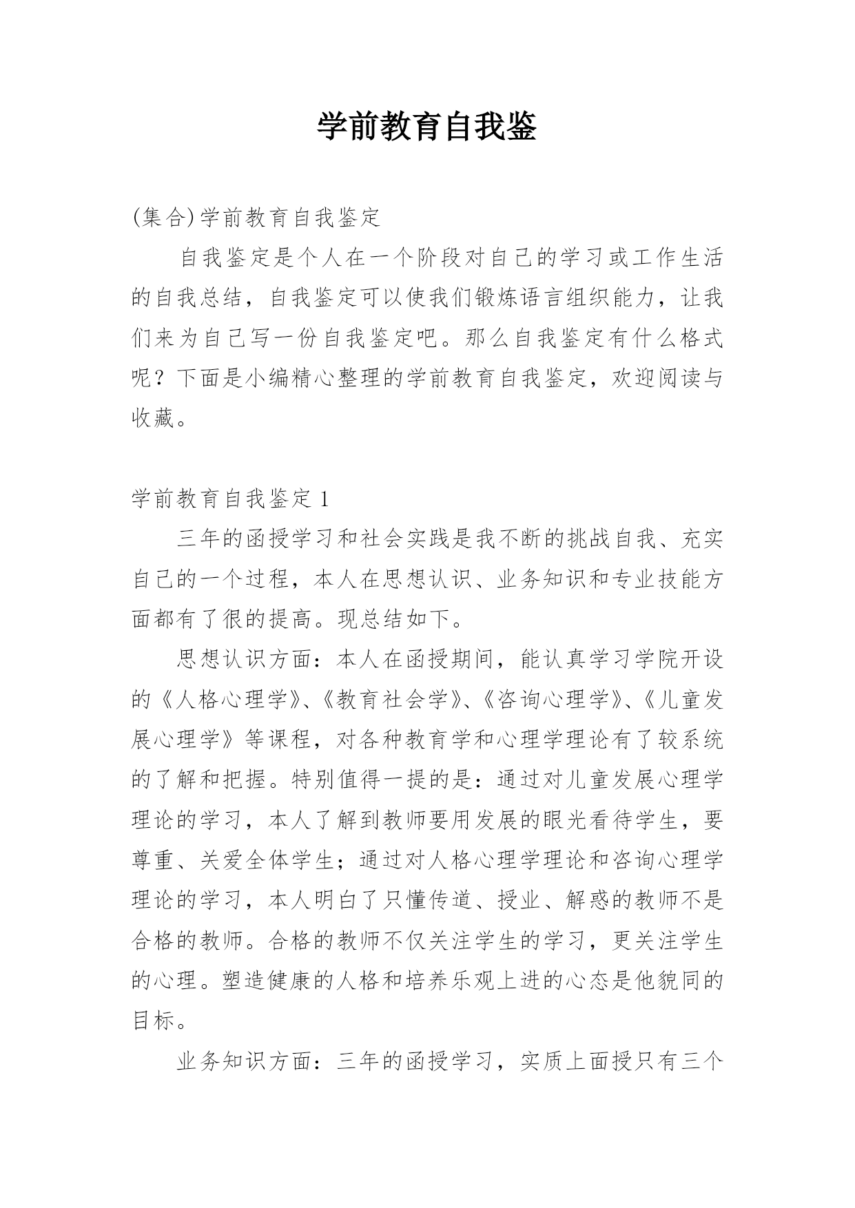 学前教育自我鉴(集合)学前教育自我鉴定自我鉴定是个人在一个阶段对自己的学习或工作生活的自我总结,自我鉴定可以使我们锻炼语言组织能力,让我们来为自己写一份自我鉴定吧。那么自我鉴定有什么格式呢?下面是小编精心整理的学前教育自我鉴定,欢迎阅读与收藏。学前教育自我鉴定1三年的函授学习和社会实践是我不断的挑战自我、充实自己的一个过程,本人在思想认识、业务知识和专业技能方面都有了很的提高。现总结如下。思想认识方面:本人在函授期间,能认真学习学院开设的《人格心理学》、《教育社会学》、《咨询心理学》、《儿童发展心理学》等