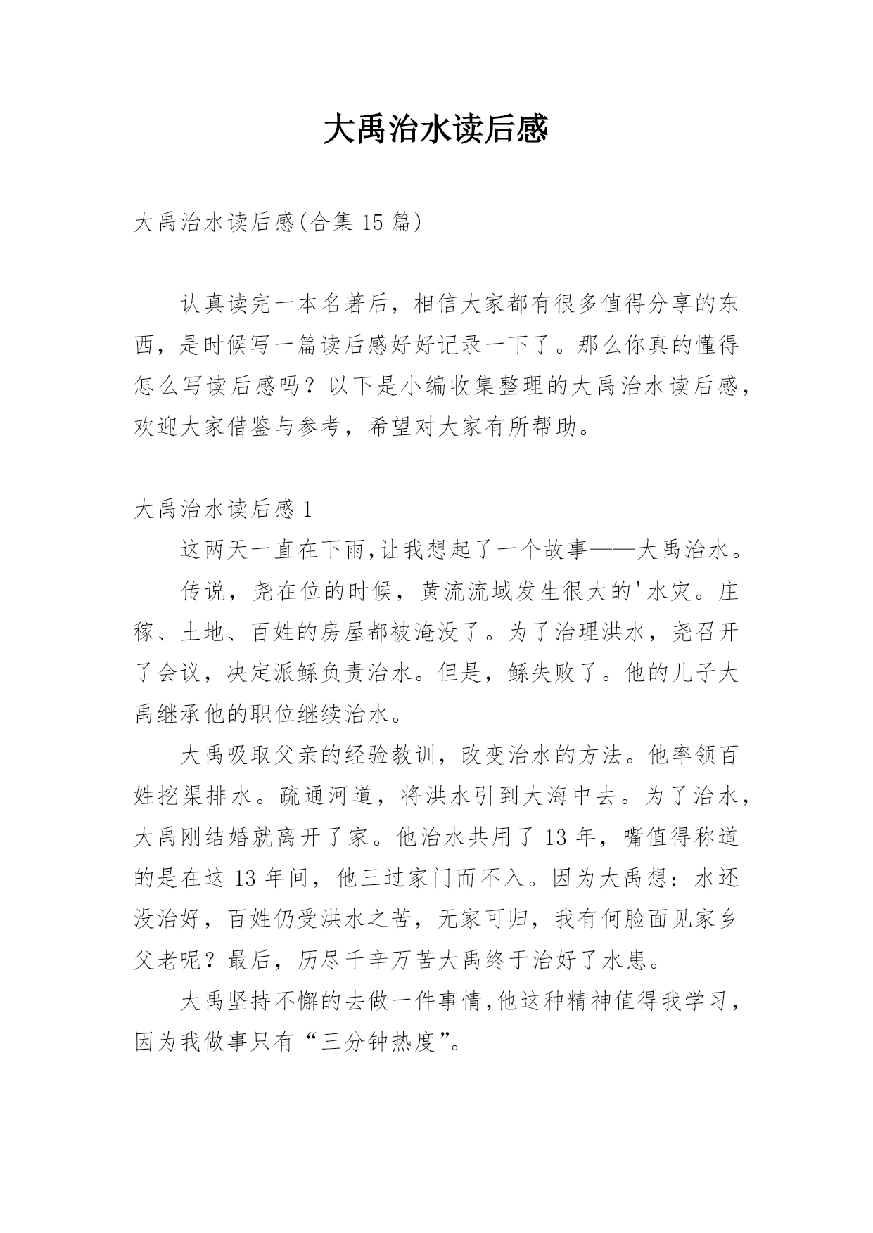 大禹治水读后感大禹治水读后感(合集15篇)认真读完一本名著后,相信大家都有很多值得分享的东西,是时候写一篇读后感好好记录一下了。那么你真的懂得怎么写读后感吗?以下是小编收集整理的大禹治水读后感,欢迎大家借鉴与参考,希望对大家有所帮助。大禹治水读后感1这两天一直在下雨,让我想起了一个故事——大禹治水。传说,尧在位的时候,黄流流域发生很大的'水灾。庄稼、土地、百姓的房屋都被淹没了。为了治理洪水,尧召开了会议,决定派鲧负责治水。但是,鲧失败了。他的儿子大禹继承他的职位继续治水。大禹吸取父亲的经验教训,改变治水的