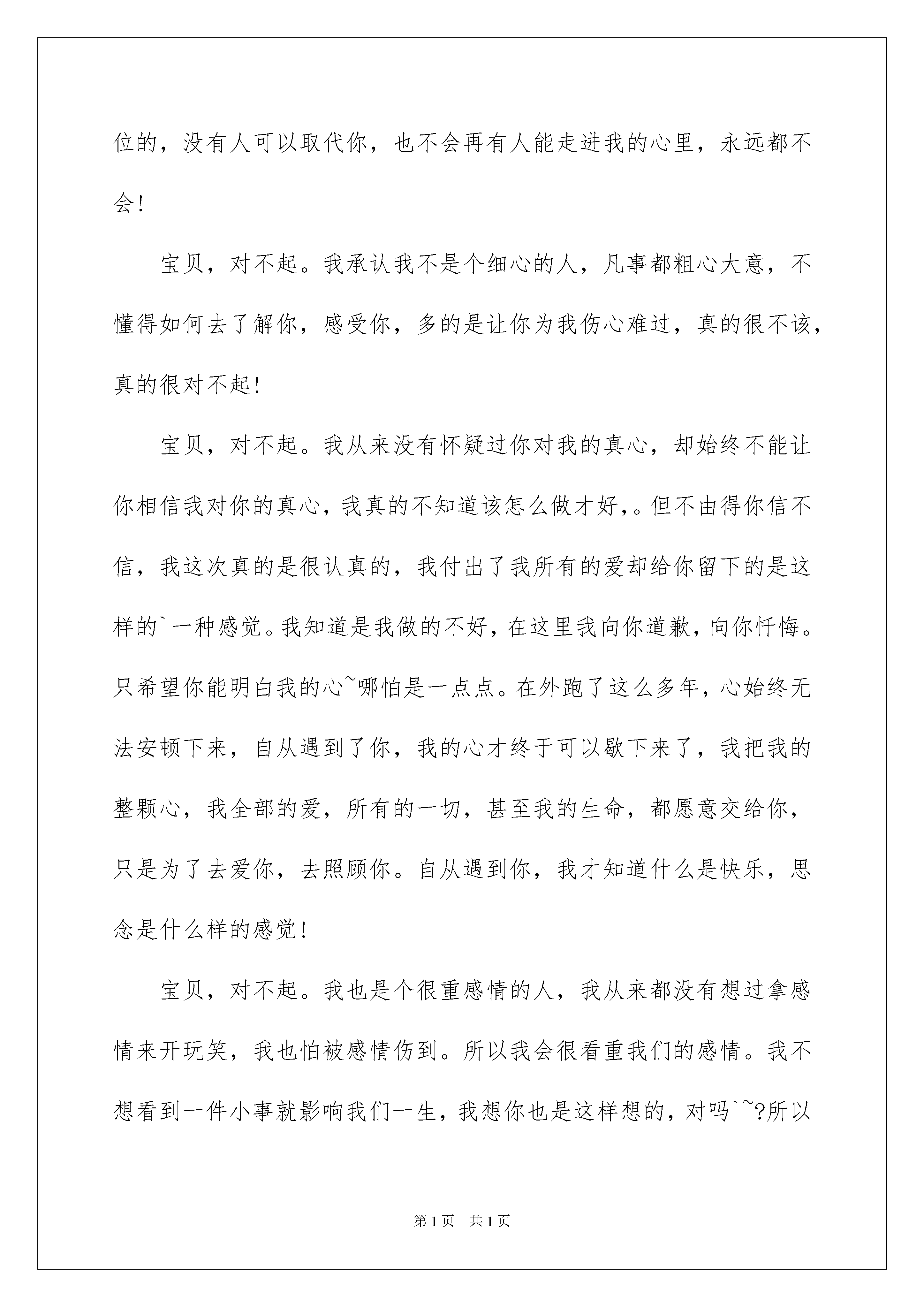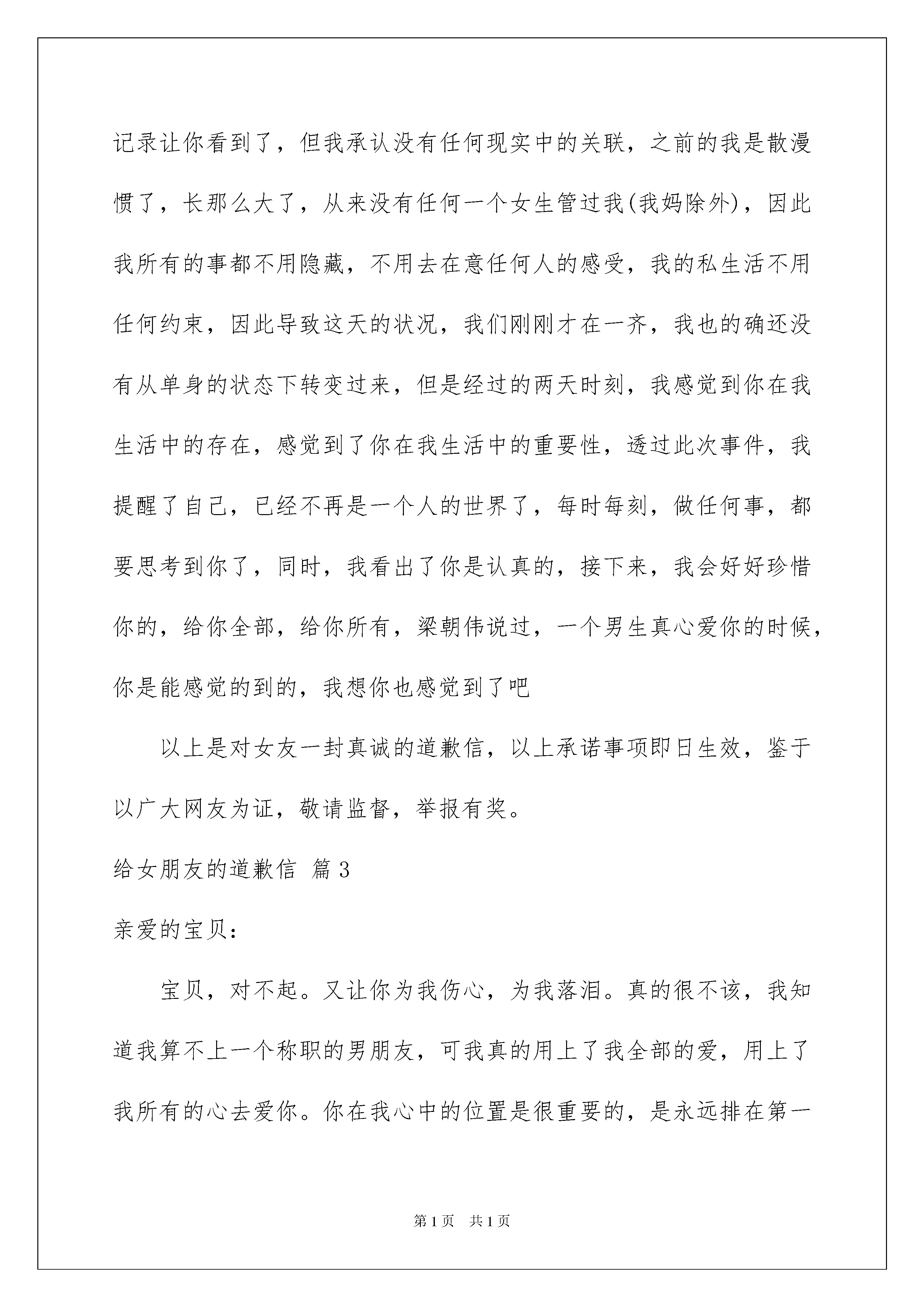 2022给女朋友道歉信锦集6篇给女朋友道歉信锦集6篇在生活中,道歉信的使用越来越广泛,在写作上,道歉信有一定的书写规范。那么你有了解过道歉信吗?下面是我收集整理的给女朋友道歉信6篇,仅供参考,大家一起来看看吧。给女朋友道歉信篇1亲爱的:曾经我们说好要一辈子,生生世世现在,你因为父母的反对,开始退缩了。我不怪你,因为我知道你父母就只有你一个女儿。你说那