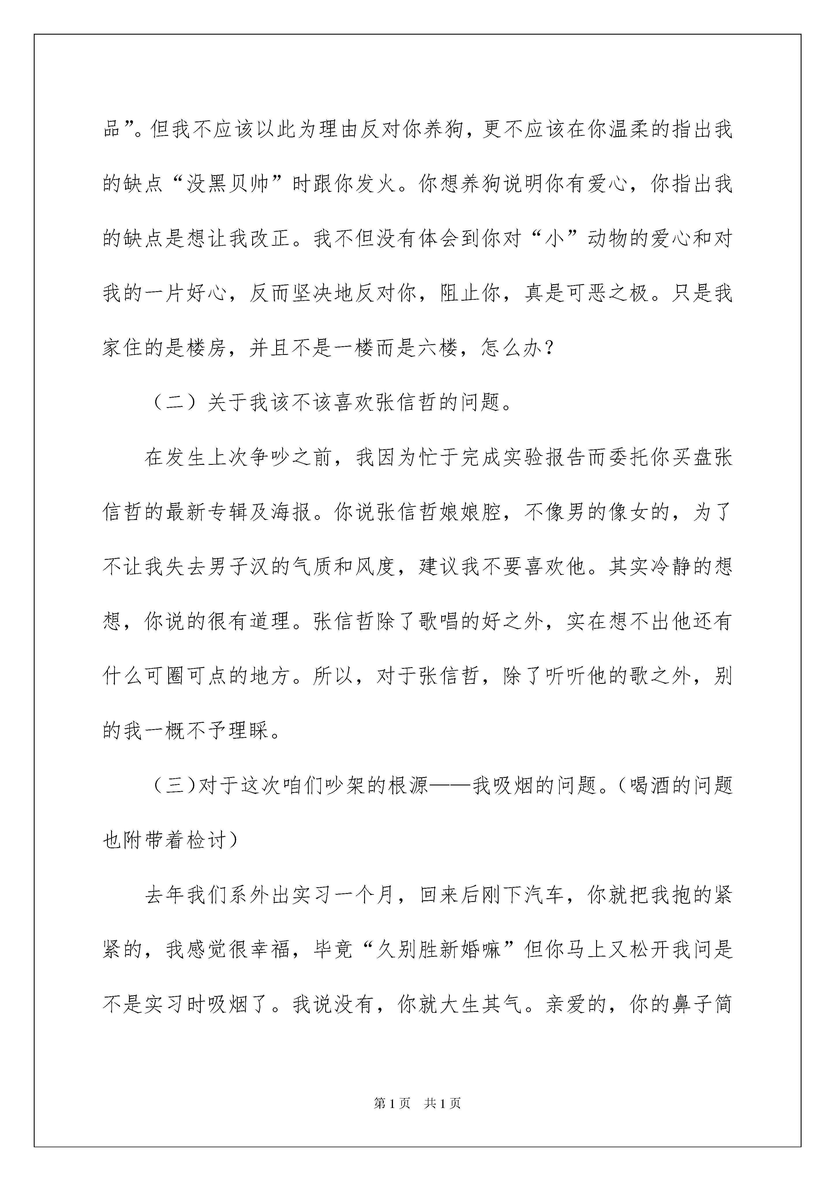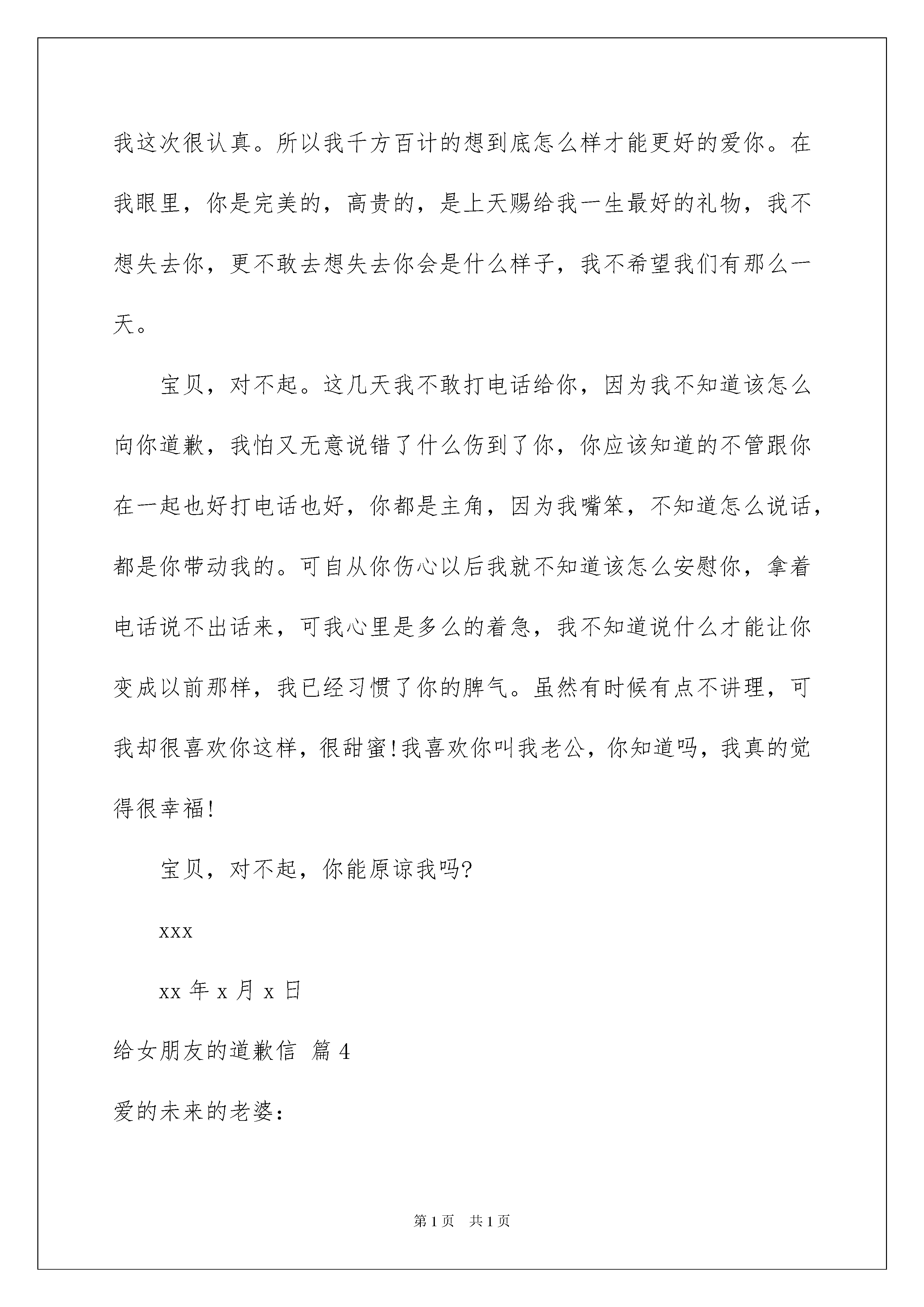2022给女朋友的道歉信锦集4篇给女朋友的道歉信锦集4篇在日常生活和工作中,需要写道歉信的场合非常的多,道歉信是当无法答应对方的所请所托或因个人失误引起对方不快时,表示陪礼道歉的一种信函。相信许多人会觉得道歉信很难写吧,下面是我帮大家整理的给女朋友的道歉信7篇,欢迎阅读,希望大家能够喜欢。给女朋友的道歉信篇1亲爱的xxx:在一起一年多来,我为我的所作