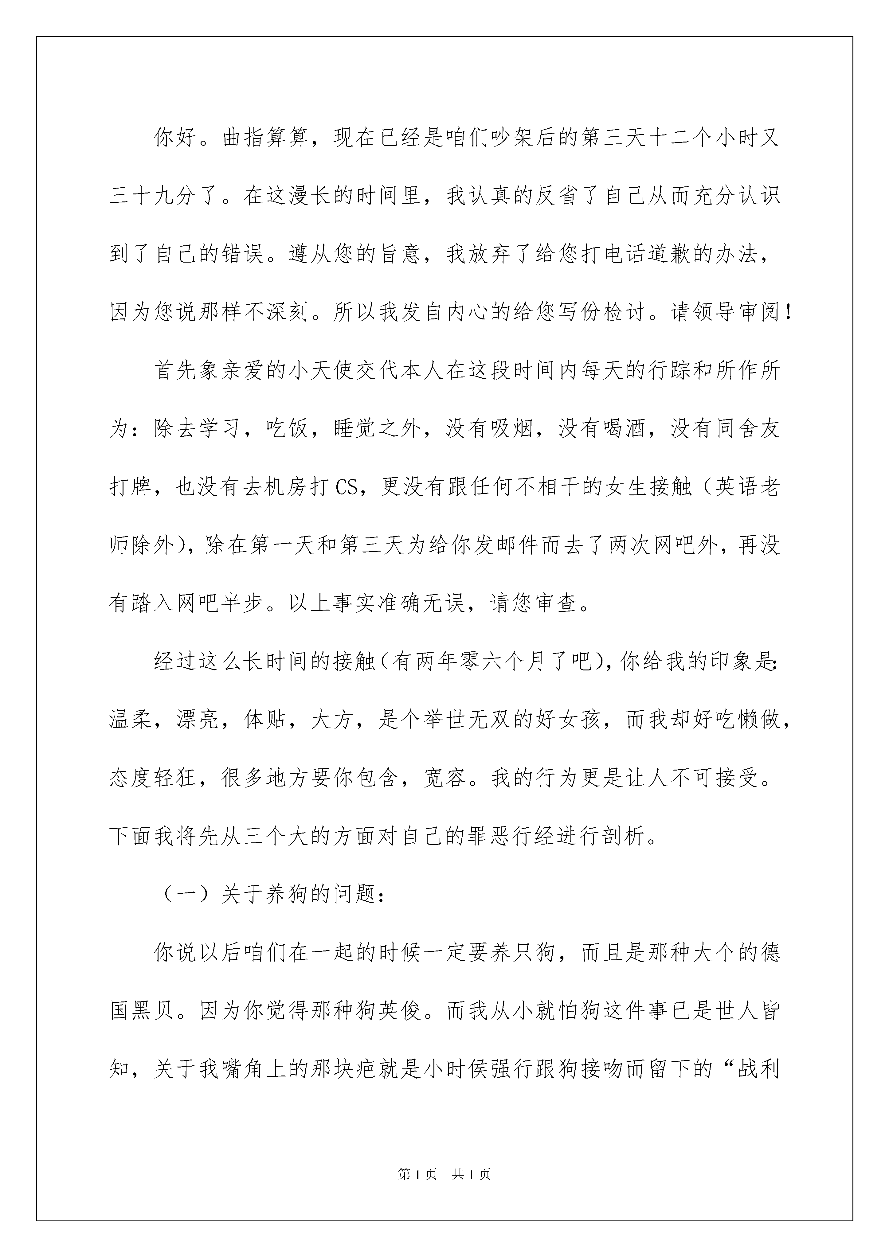 2022女朋友道歉信锦集10篇女朋友道歉信锦集10篇在社会发展不断提速的今天,我们常常要运用到道歉信,道歉信是当无法答应对方的所请所托或因个人失误引起对方不快时,表示陪礼道歉的一种信函。如何写一份恰当的道歉信呢?以下是我收集整理的女朋友道歉信10篇,仅供参考,欢迎大家阅读。女朋友道歉信篇1亲爱的老婆大人:遵照您的旨意,我在书房里反省了一个小时四十三分