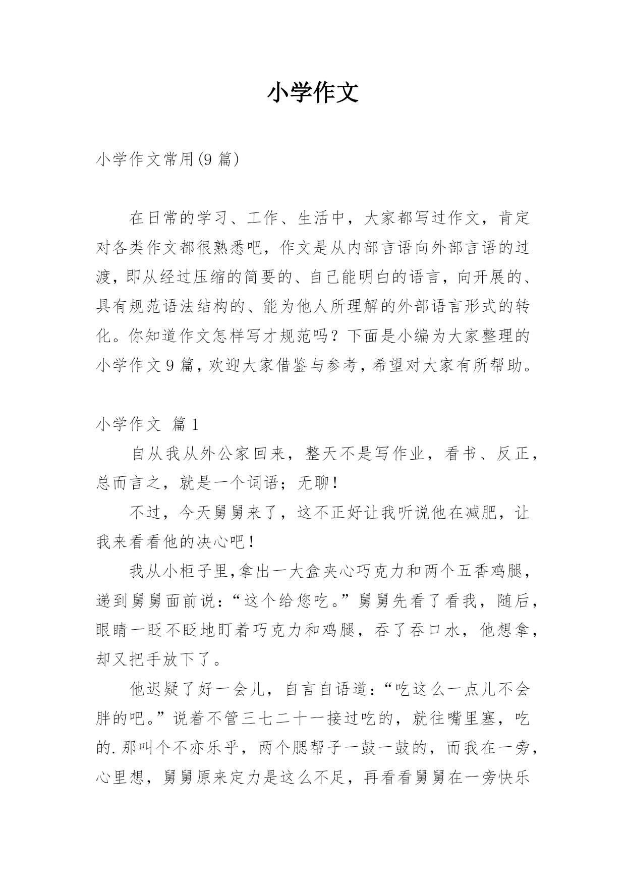 小学作文小学作文常用(9篇)在日常的学习、工作、生活中,大家都写过作文,肯定对各类作文都很熟悉吧,作文是从内部言语向外部言语的过渡,即从经过压缩的简要的、自己能明白的语言,向开展的、具有规范语法结构的、能为他人所理解的外部语言形式的转化。你知道作文怎样写才规范吗?下面是小编为大家整理的小学作文9篇,欢迎大家借鉴与参考,希望对大家有所帮助。小学作文篇1自从我从外公家回来,整天不是写作业,看书、反正,总而言之,就是一个词语;无聊!不过,今天舅舅来了,这不正好让我听说他在减肥,让我来看看他的决心吧!我从小柜子里