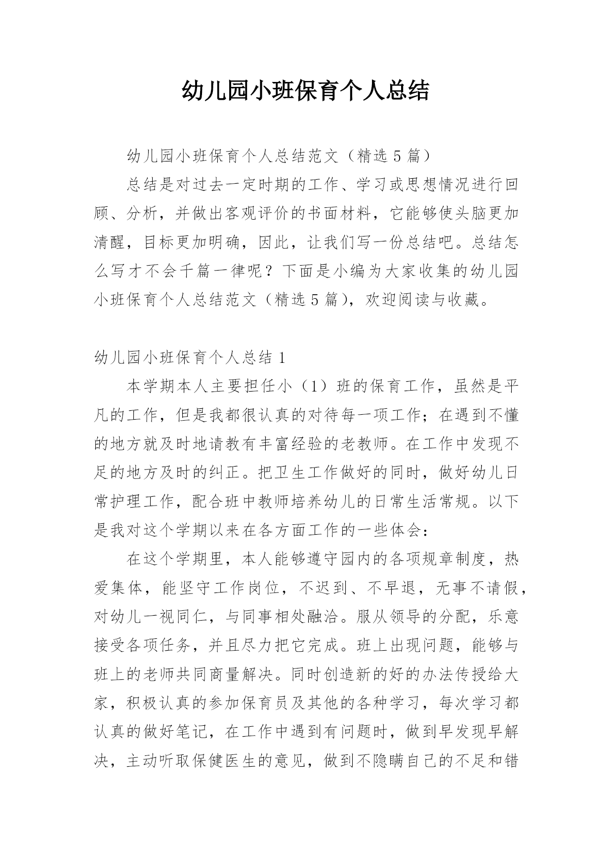 幼儿园小班保育个人总结幼儿园小班保育个人总结总结是指社会团体、企业单位和个人对某一阶段的学习、工作或其完成情况加以回顾和分析,得出教训和一些规律性认识的一种书面材料,它可以给我们下一阶段的学习和工作生活做指导,不如立即行动起来写一份总结吧。那么总结应该包括什么内容呢?以下是小编精心整理的幼儿园小班保育个人总结,欢迎阅读与收藏。幼儿园小班保育个人总结1一个学期转眼就过去了,在幼儿园领导的指导下,在同事们得关心,支持和帮助下,使我学会了很多,也使我干好了我的本质工作,同时也取得了一定的成绩,在这里,我也该整理