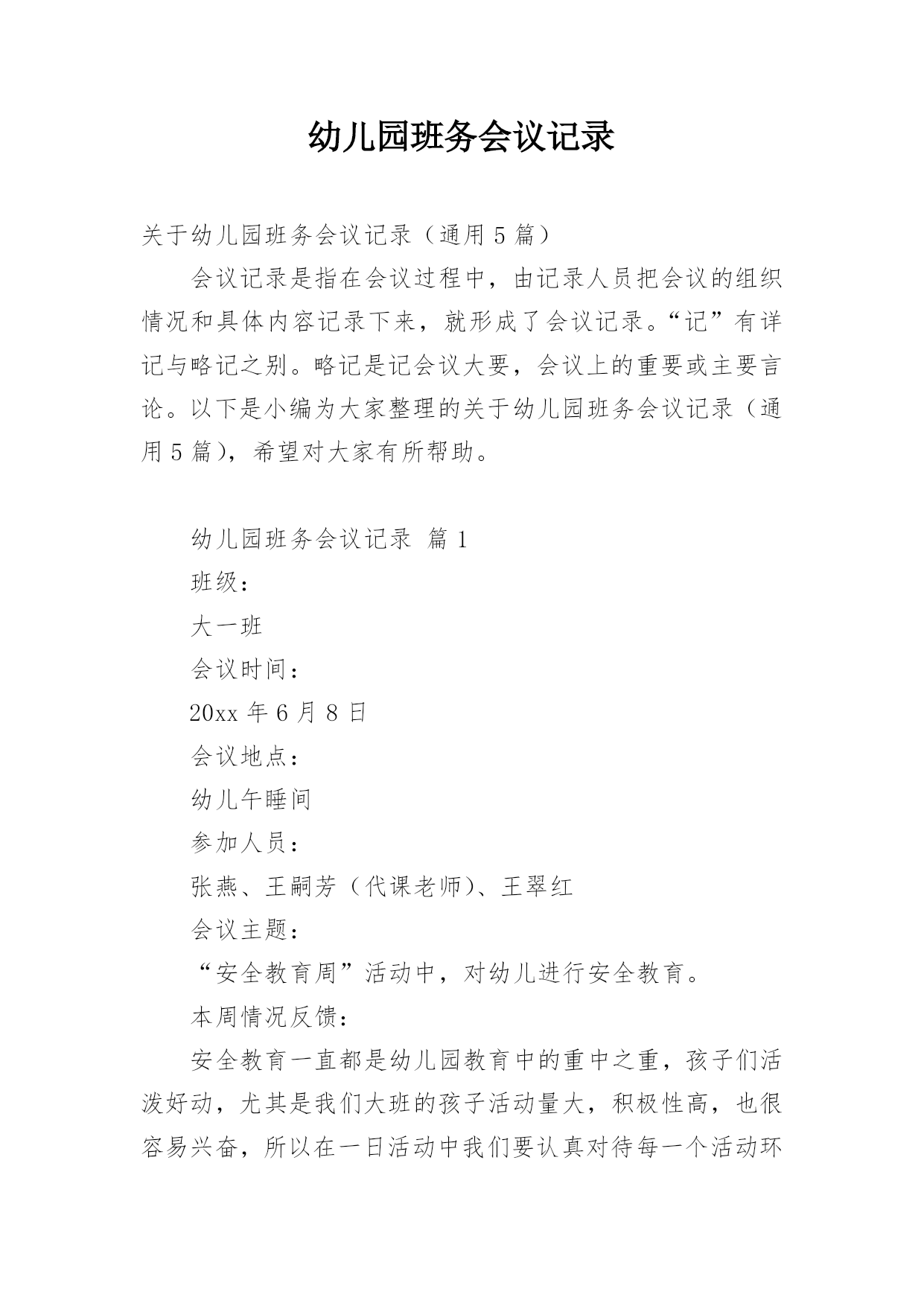 最新幼儿园班务会议记录最新幼儿园班务会议记录安全教育一直都是幼儿园教育中的重中之重,孩子们活泼好动,尤其是我们大班的孩子活动量大,积极性高,也很容易兴奋,所以在一日活动中我们要认真对待每一个活动环节,让孩子在安全、快乐的环境中去探索、去学习。以下是小编精心为大家整理的最新幼儿园班务会议记录,推荐给大家参考,欢迎大家前来阅读。最新幼儿园班务会议记录:篇一一、上学期情况总结:班内三位老师是一个小家庭,老师、家长、孩子是一个大家庭,我们有缘走到一起,我们更有缘组成了“大二班”这个大家庭。我们想着家长的顾虑,更想