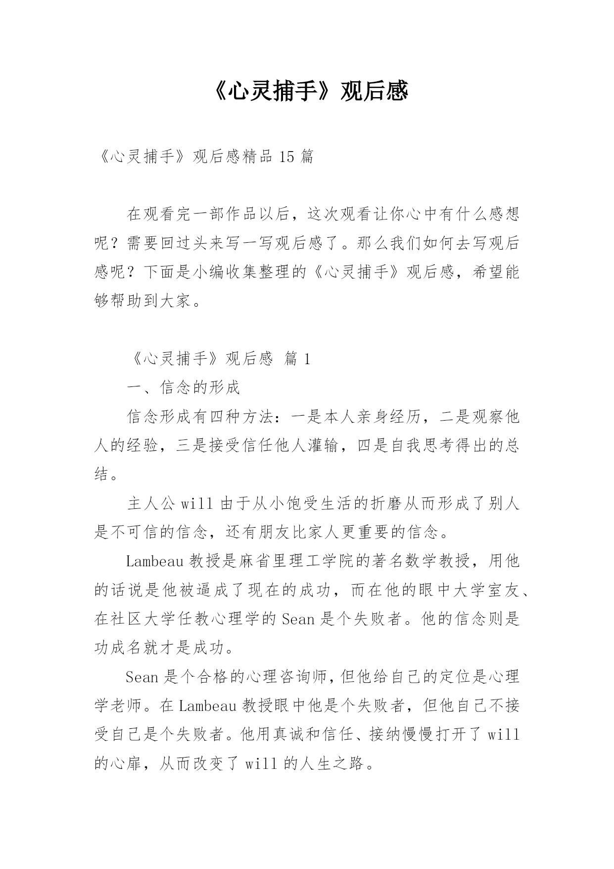 《心灵捕手》观后感《心灵捕手》观后感精品15篇在观看完一部作品以后,这次观看让你心中有什么感想呢?需要回过头来写一写观后感了。那么我们如何去写观后感呢?下面是小编收集整理的《心灵捕手》观后感,希望能够帮助到大家。《心灵捕手》观后感篇1一、信念的形成信念形成有四种方法:一是本人亲身经历,二是观察他人的经验,三是接受信任他人灌输,四是自我思考得出的总结。主人公will由于从小饱受生活的折磨从而形成了别人是不可信的信念,还有朋友比家人更重要的信念。Lambeau教授是麻省里理工学院的著名数学教授,用他的话说是他