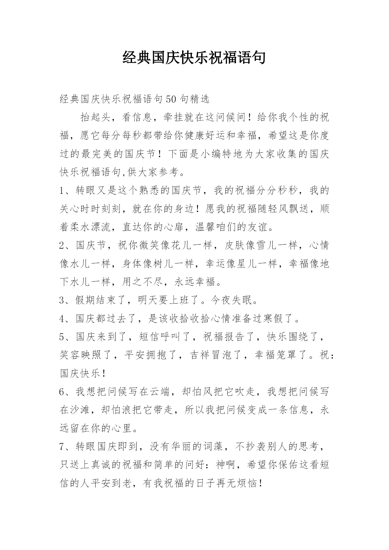 经典国庆快乐祝福语句经典国庆快乐祝福语句50句精选抬起头,看信息,牵挂就在这问候间!给你我个性的祝福,愿它每分每秒都带给你健康好运和幸福,希望这是你度过的最完美的国庆节!下面是小编特地为大家收集的国庆快乐祝福语句,供大家参考。1、转眼又是这个熟悉的国庆节,我的祝福分分秒秒,我的关心时时刻刻,就在你的身边!愿我的祝福随轻风飘送,顺着柔水漂流,直达你的心扉,温馨咱们的友谊。2、国庆节,祝你微笑像花儿一样,皮肤像雪儿一样,心情像水儿一样,身体像树儿一样,幸运像星儿一样,幸福像地下水儿一样,用之不尽,永远幸福。3