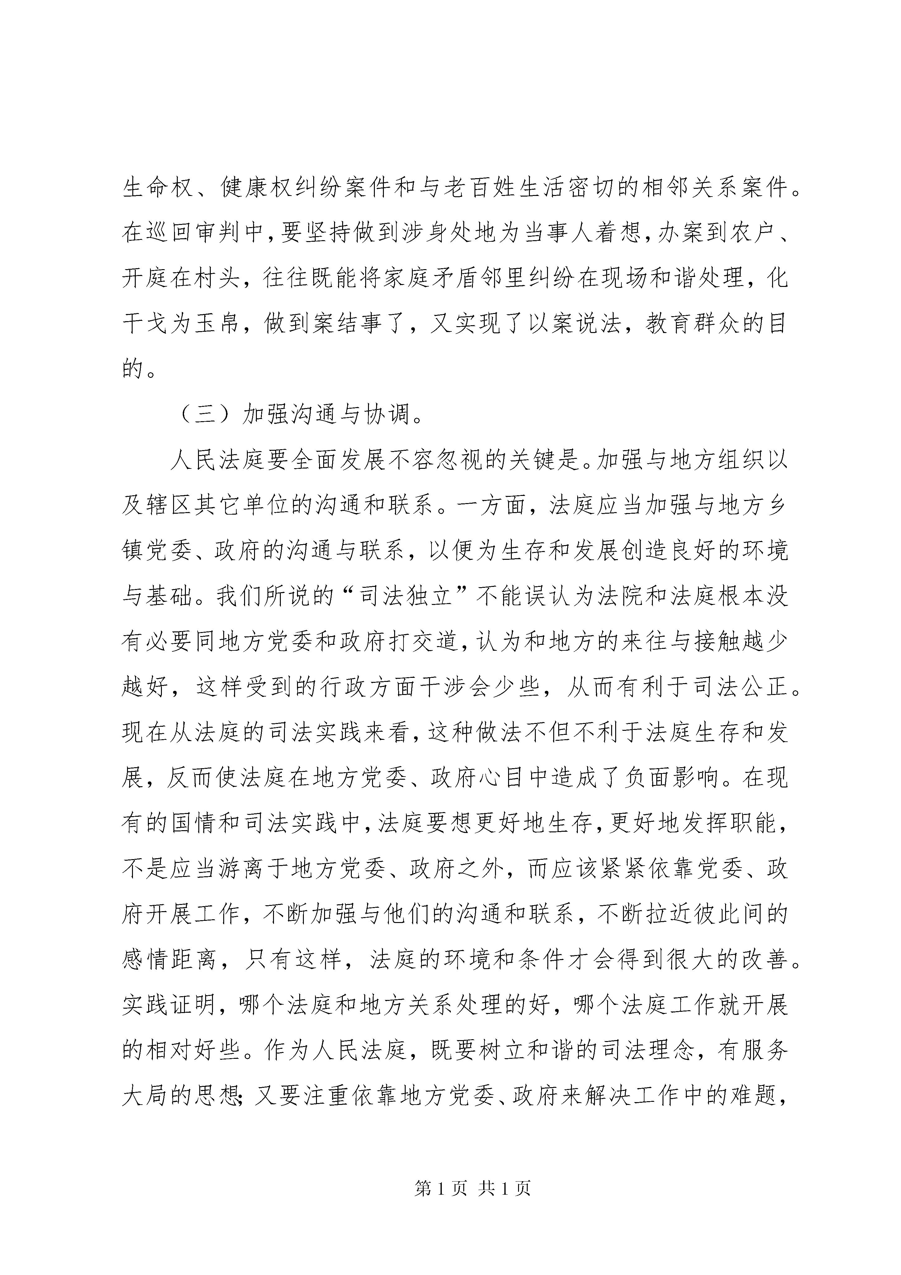 县法院人民法庭论坛座谈会领导讲话同志们:经过一段时间的准备今天我们在此召开首次人民法庭论坛座谈会。刚才各位中心法庭庭长就如何贴近民生充分发挥职能更进一步提高人民法庭工作水平等依次作了发言有的发言有很强的针对性和可操作性看得出同志们是经过充分调查研究和认真思考的。这些发言我们建议各位经过认真修改整理将陆续发表在《xx审判》和我院网站上。近年来我院人民法庭工作在党组和全院干警特别是人民法庭同志们的努力下取得了长足的进展多项主要工作已居全市上游。多次受到上级法院领导的肯定。但