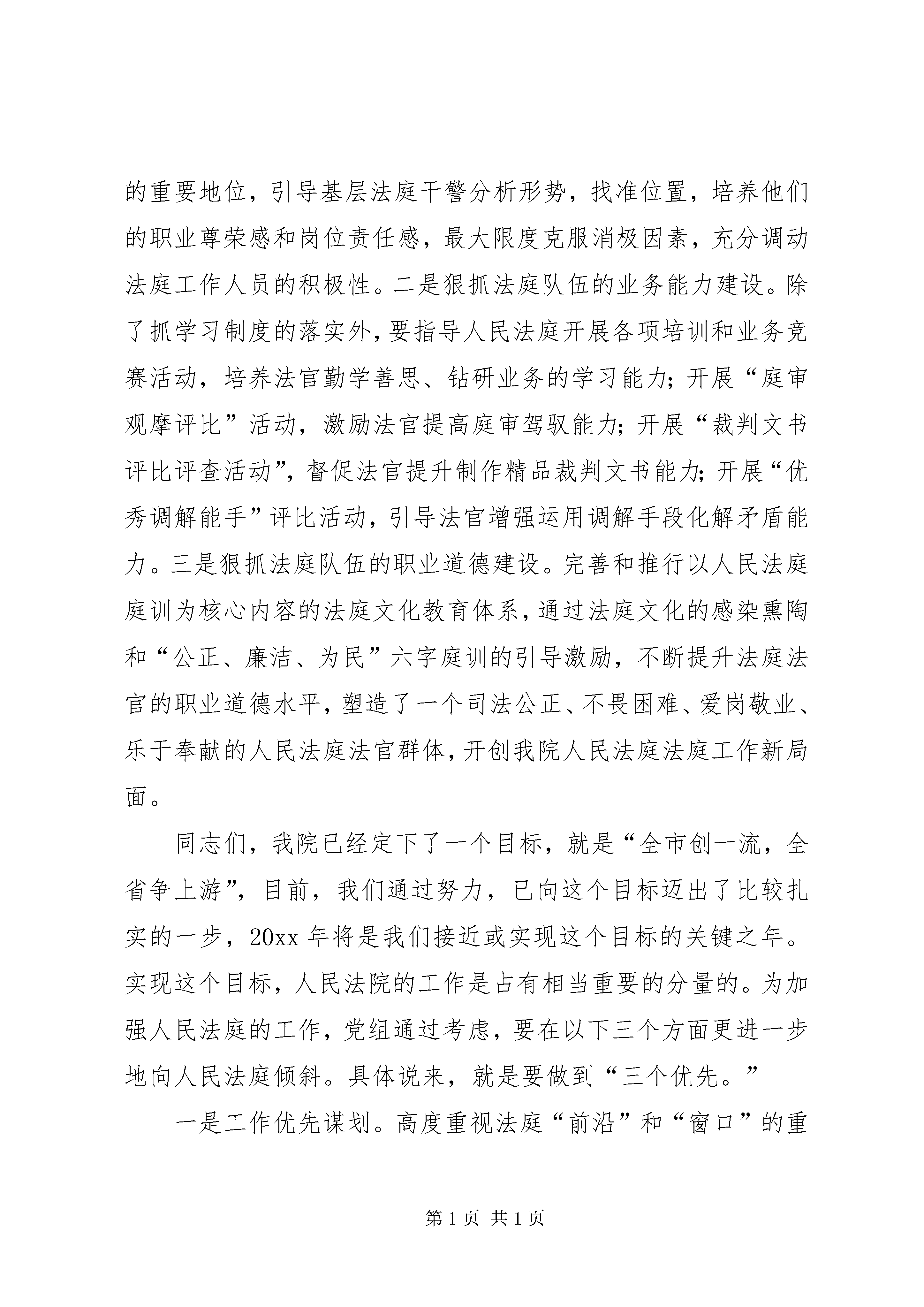 县法院人民法庭论坛座谈会领导讲话同志们:经过一段时间的准备,今天我们在此召开首次人民法庭论坛座谈会。刚才,各位中心法庭庭长就如何贴近民生,充分发挥职能,更进一步提高人民法庭工作水平等依次作了发言,有的发言有很强的针对性和可操作性,看得出同志们是经过充分调查研究和认真思考的。这些发言我们建议各位经过认真修改整理,将陆续发表在《xx审判》和我院网站上。近年来,我院人民法庭工作在党组和全院干警特别是人民法庭同志们的努力下,取得了长足的进展,多项主要工作已居全市上游。多次受到上级法院领导