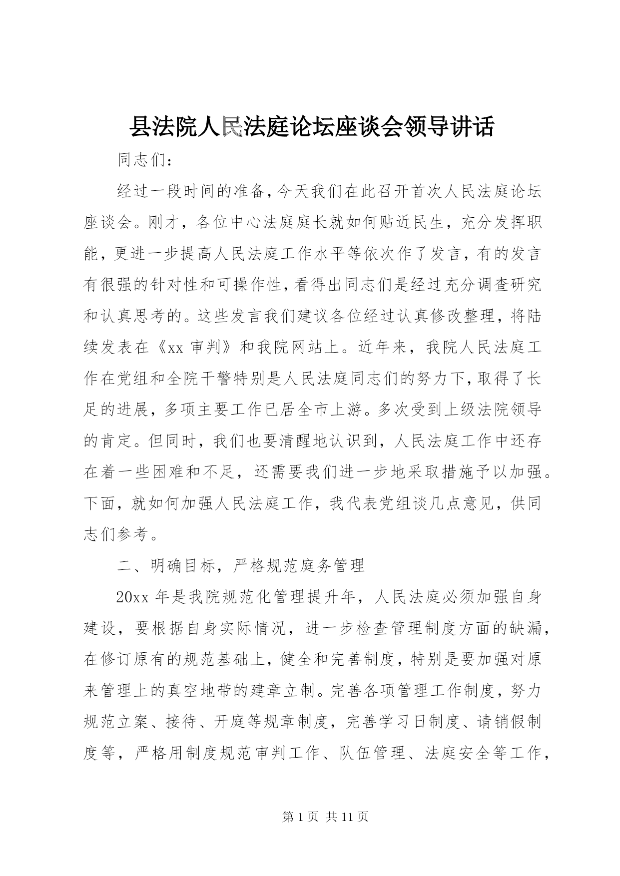 县法院人民法庭论坛座谈会领导讲话县法院人民法庭论坛座谈会领导讲话同志们:经过一段时间的准备,今天我们在此召开首次人民法庭论坛座谈会。刚才,各位中心法庭庭长就如何贴近民生,充分发挥职能,更进一步提高人民法庭工作水平等依次作了发言,有的发言有很强的针对性和可操作性,看得出同志们是经过充分调查分析和认真思考的。这些发言我们建议各位经过认真修改整理,将陆续发表在xx审判和我院网站上。近年来,我院人民法庭工作在党组和全院干警特别是人民法庭同志们的努力下,取得了长足的进展,多项主要工作已居全市上游。多次受到上级法院领