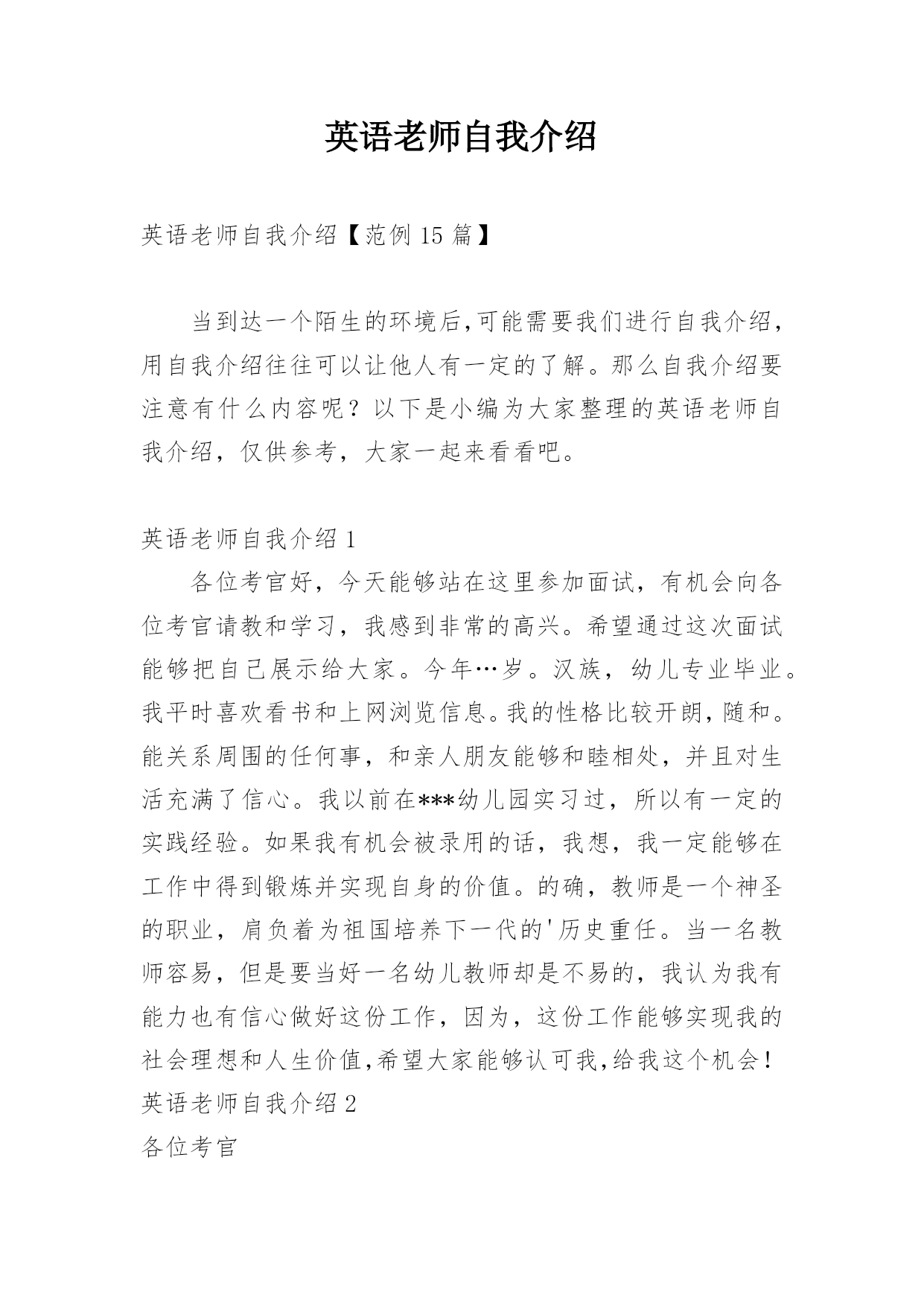 英语老师自我介绍英语老师自我介绍【范例15篇】当到达一个陌生的环境后,可能需要我们进行自我介绍,用自我介绍往往可以让他人有一定的了解。那么自我介绍要注意有什么内容呢?以下是小编为大家整理的英语老师自我介绍,仅供参考,大家一起来看看吧。英语老师自我介绍1各位考官好,今天能够站在这里参加面试,有机会向各位考官请教和学习,我感到非常的高兴。希望通过这次面试能够把自己展示给大家。今年…岁。汉族,幼儿专业毕业。我平时喜欢看书和上网浏览信息。我的性格比较开朗,随和。能关系周围的任何事,和亲人朋友能够和睦相处,并且对生