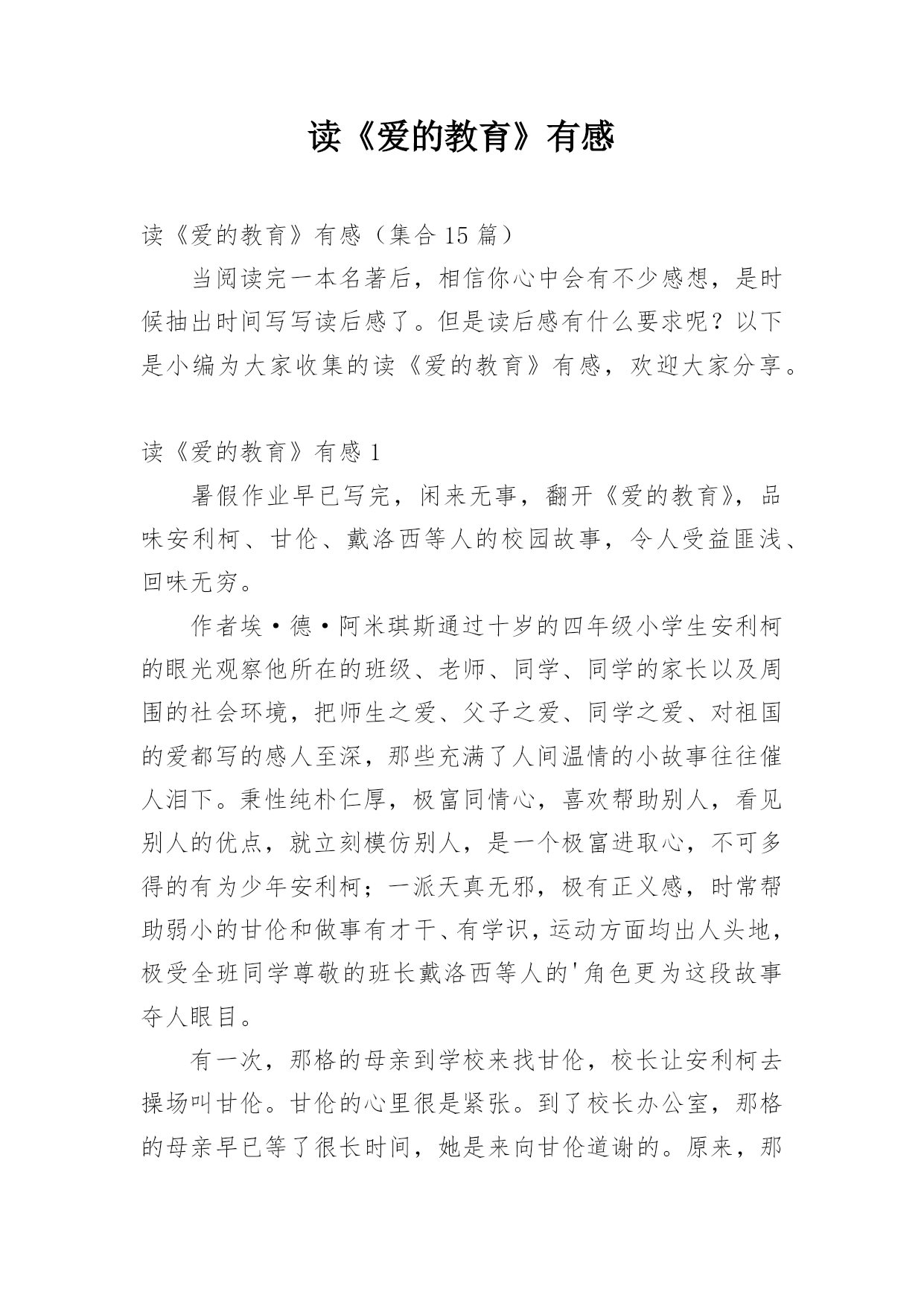 读《爱的教育》有感读《爱的教育》有感(集合15篇)当阅读完一本名著后,相信你心中会有不少感想,是时候抽出时间写写读后感了。但是读后感有什么要求呢?以下是小编为大家收集的读《爱的教育》有感,欢迎大家分享。读《爱的教育》有感1暑假作业早已写完,闲来无事,翻开《爱的教育》,品味安利柯、甘伦、戴洛西等人的校园故事,令人受益匪浅、回味无穷。作者埃·德·阿米琪斯通过十岁的四年级小学生安利柯的眼光观察他所在的班级、老师、同学、同学的家长以及周围的社会环境,把师生之爱、父子之爱、同学之爱、对祖国的爱都写的感人至深,那些充