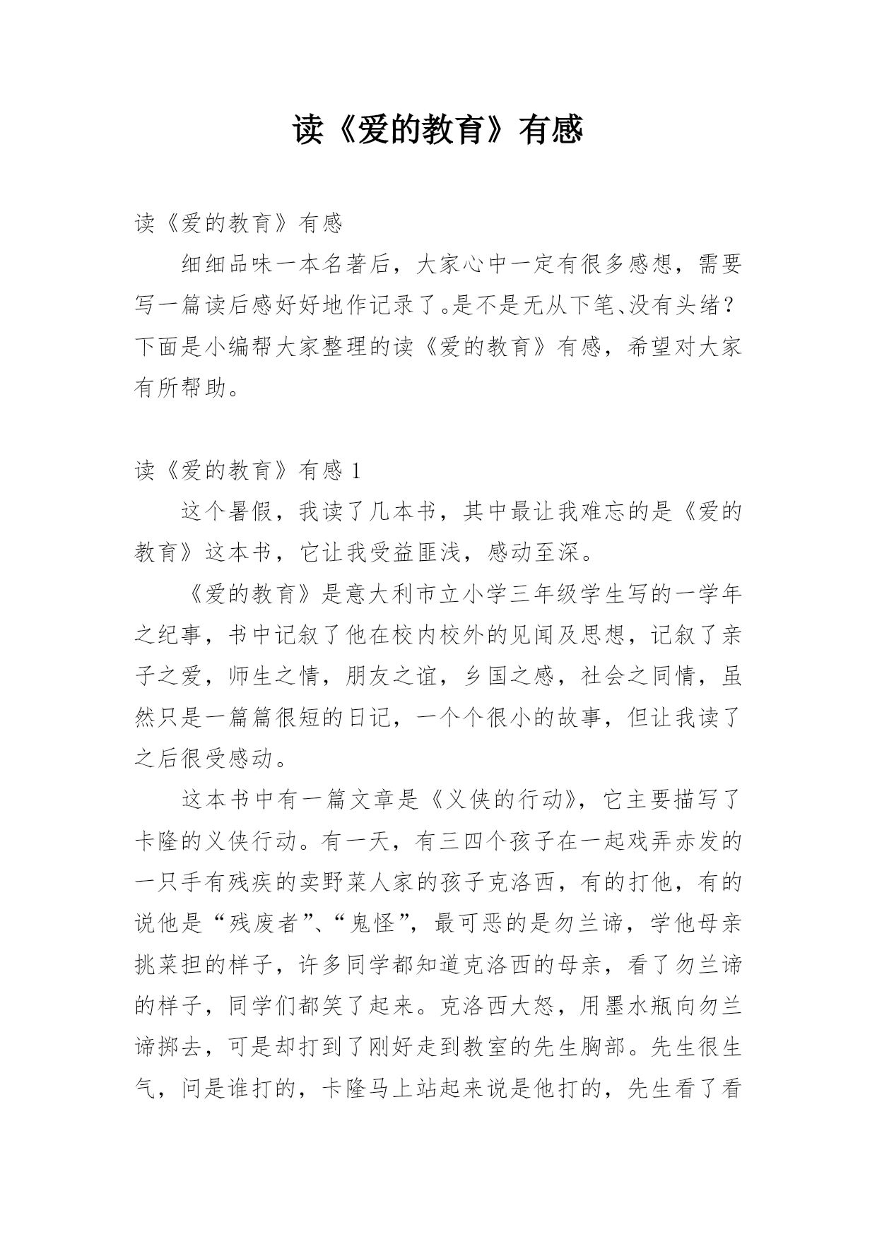 读《爱的教育》有感读《爱的教育》有感(通用30篇)品味完一本名著后,相信大家都积累了属于自己的读书感悟,这时就有必须要写一篇读后感了!为了让您不再为写读后感头疼,下面是小编为大家整理的读《爱的教育》有感(通用30篇),供大家参考借鉴,希望可以帮助到有需要的朋友。读《爱的教育》有感篇1“爱”是《爱的教育》的灵魂:爱父母、爱老师、爱同学、爱邻居,爱一切普通的`善良者,爱那些素不相识却渴望温暖的不幸者……在阅读过程中,我被作者那平凡而细腻的笔触中体现出来的近乎完美的师生之情、父子之爱、朋友之谊……所吸引,被文中