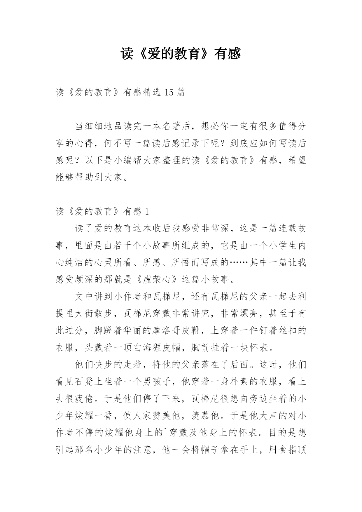 读《爱的教育》有感读《爱的教育》有感精选15篇当细细地品读完一本名著后,想必你一定有很多值得分享的心得,何不写一篇读后感记录下呢?到底应如何写读后感呢?以下是小编帮大家整理的读《爱的教育》有感,希望能够帮助到大家。读《爱的教育》有感1读了爱的教育这本收后我感受非常深,这是一篇连载故事,里面是由若干个小故事所组成的,它是由一个小学生内心纯洁的心灵所看、所感、所悟而写成的……其中一篇让我感受颇深的那就是《虚荣心》这篇小故事。文中讲到小作者和瓦梯尼,还有瓦梯尼的父亲一起去利提里大街散步,瓦梯尼穿戴非常讲究,非常