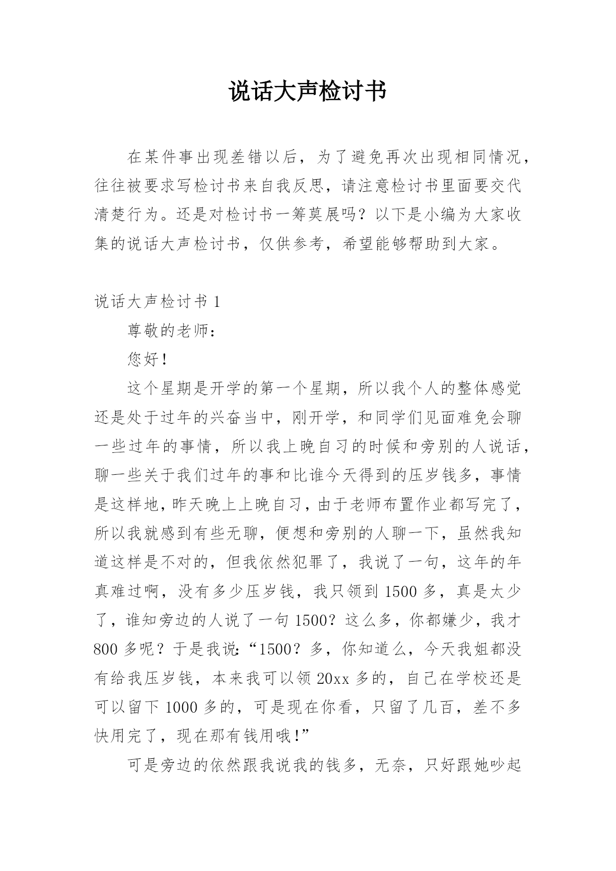 说话大声检讨书在某件事出现差错以后,为了避免再次出现相同情况,往往被要求写检讨书来自我反思,请注意检讨书里面要交代清楚行为。还是对检讨书一筹莫展吗?以下是小编为大家收集的说话大声检讨书,仅供参考,希望能够帮助到大家。说话大声检讨书1尊敬的老师:您好!这个星期是开学的第一个星期,所以我个人的整体感觉还是处于过年的兴奋当中,刚开学,和同学们见面难免会聊一些过年的事情,所以我上晚自习的时候和旁别的人说话,聊一些关于我们过年的事和比谁今天得到的压岁钱多,事情是这样地,昨天晚上上晚自习,由于老师布置作业都写完了,所