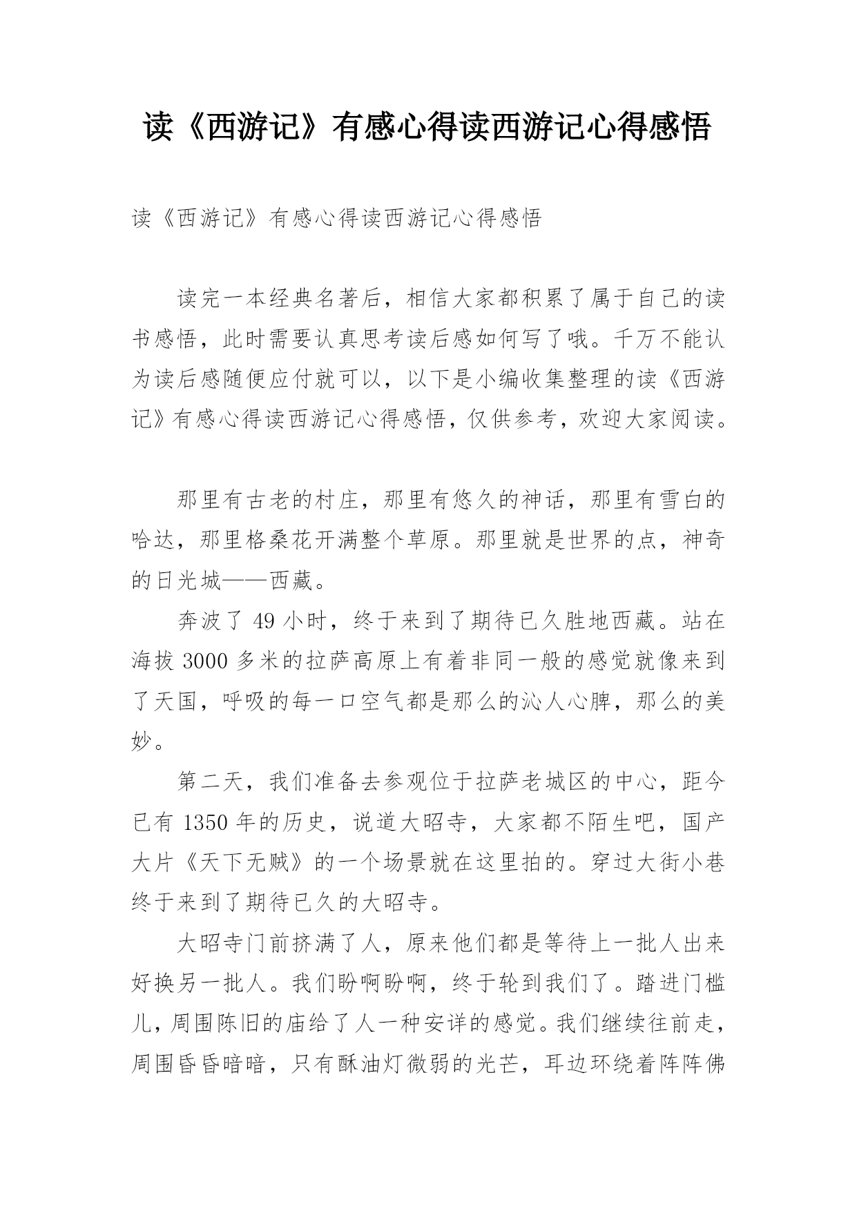 读《西游记》有感心得读西游记心得感悟读《西游记》有感心得读西游记心得感悟读完一本经典名著后,相信大家都积累了属于自己的读书感悟,此时需要认真思考读后感如何写了哦。千万不能认为读后感随便应付就可以,以下是小编收集整理的读《西游记》有感心得读西游记心得感悟,仅供参考,欢迎大家阅读。那里有古老的村庄,那里有悠久的神话,那里有雪白的哈达,那里格桑花开满整个草原。那里就是世界的点,神奇的日光城——西藏。奔波了49小时,终于来到了期待已久胜地西藏。站在海拔3000多米的拉萨高原上有着非同一般的感觉就像来到了天国,呼吸