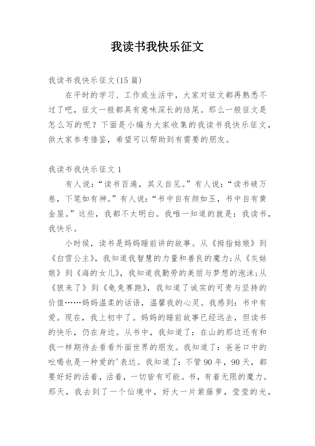 我读书我快乐征文我读书我快乐征文(15篇)在平时的学习、工作或生活中,大家对征文都再熟悉不过了吧,征文一般都具有意味深长的结尾。那么一般征文是怎么写的呢?下面是小编为大家收集的我读书我快乐征文,供大家参考借鉴,希望可以帮助到有需要的朋友。我读书我快乐征文1有人说:“读书百遍,其义自见。”有人说:“读书破万卷,下笔如有神。”有人说:“书中自有颜如玉,书中自有黄金屋。”这些,我都不太明白。我唯一知道的就是:我读书,我快乐。小时候,读书是妈妈睡前讲的故事。从《拇指姑娘》到《白雪公主》,我知道我智慧的力量和善良的