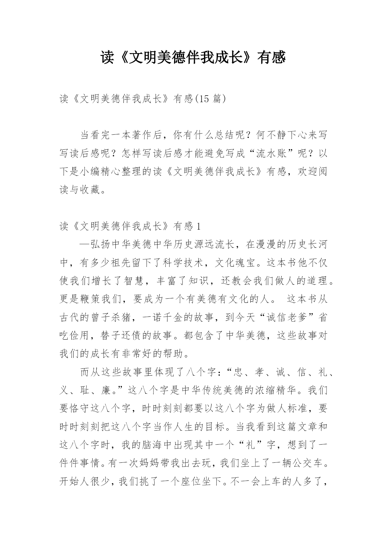 读《文明美德伴我成长》有感读《文明美德伴我成长》有感(15篇)当看完一本著作后,你有什么总结呢?何不静下心来写写读后感呢?怎样写读后感才能避免写成“流水账”呢?以下是小编精心整理的读《文明美德伴我成长》有感,欢迎阅读与收藏。读《文明美德伴我成长》有感1—弘扬中华美德中华历史源远流长,在漫漫的历史长河中,有多少祖先留下了科学技术,文化魂宝。这本书他不仅使我们增长了智慧,丰富了知识,还教会我们做人的道理。更是鞭策我们,要成为一个有美德有文化的人。这本书从古代的曾子杀猪,一诺千金的故事,到今天“诚信老爹”省吃俭