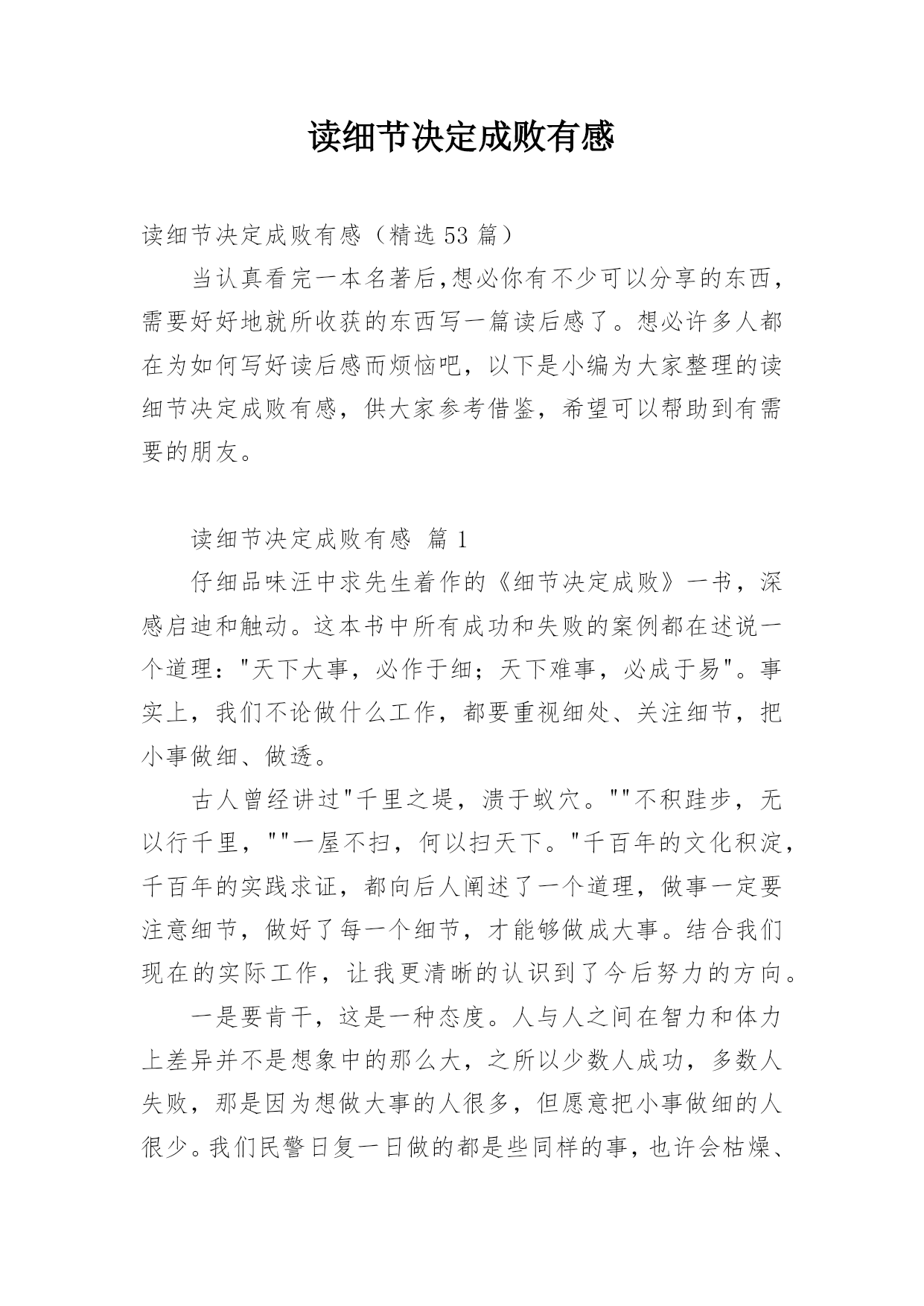 读细节决定成败有感读细节决定成败有感(精选53篇)当认真看完一本名著后,想必你有不少可以分享的东西,需要好好地就所收获的东西写一篇读后感了。想必许多人都在为如何写好读后感而烦恼吧,以下是小编为大家整理的读细节决定成败有感,供大家参考借鉴,希望可以帮助到有需要的朋友。读细节决定成败有感篇1仔细品味汪中求先生着作的《细节决定成败》一书,深感启迪和触动。这本书中所有成功和失败的案例都在述说一个道理:"天下大事,必作于细;天下难事,必成于易"。事实上,我们不论做什么工作,都要重视细处、关注细节,把小事做细、做透。