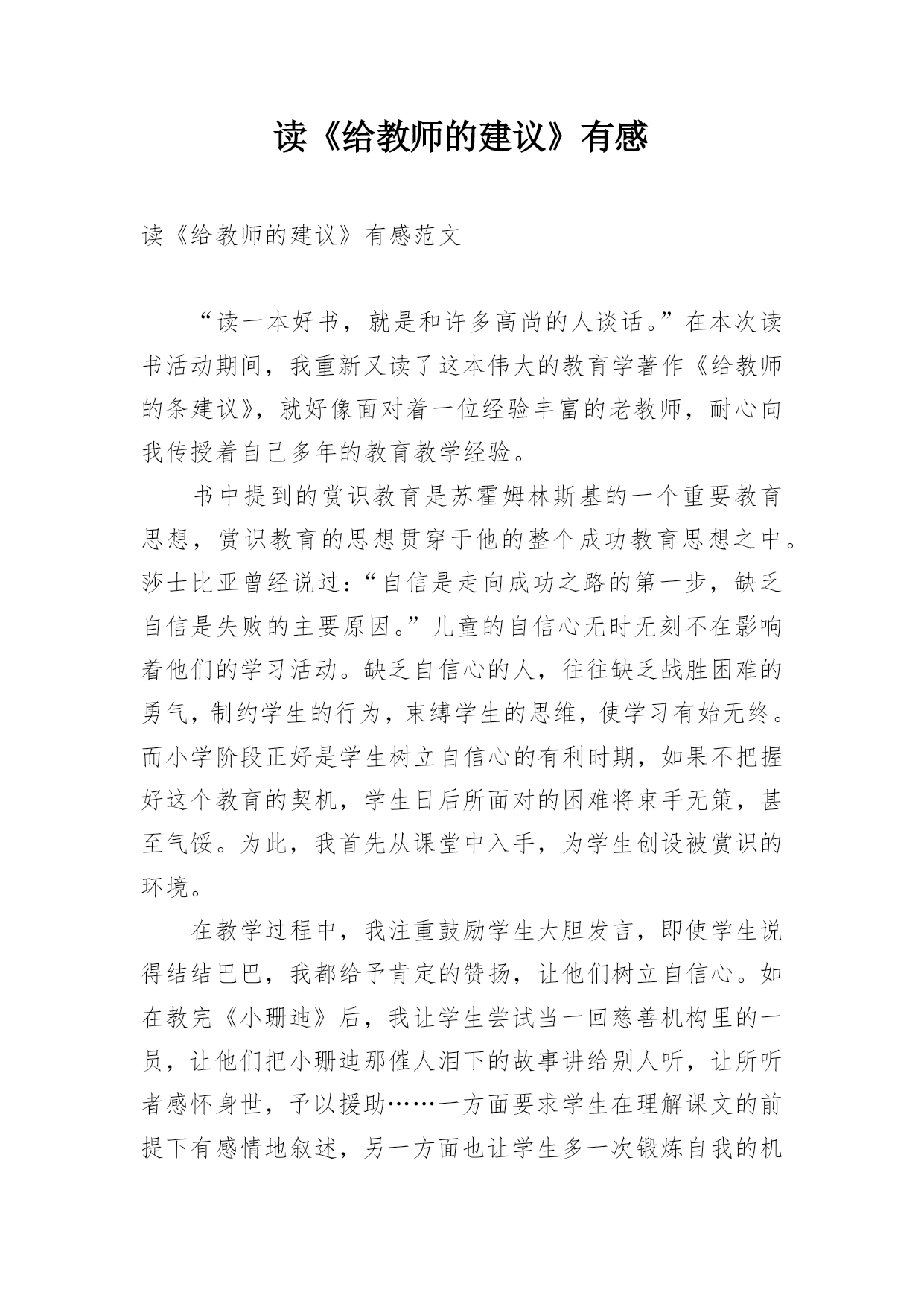 读《给教师的建议》心得体会读《给教师的建议》心得体会有了一些收获以后,马上将其记录下来,通过写心得体会,可以帮助我们总结积累经验。那么要如何写呢?下面是小编整理的读《给教师的建议》心得体会,欢迎阅读,希望大家能够喜欢。“书籍是人类进步的阶梯”,我爱读书,读书能给人以美的享受,给人以智慧的启迪,畅游在书海里,心灵可以得到净化。在几次的学习培训中,培训的老师都推荐着这本《给教师的建议》,于是我在网上购买了这本书,看后感慨颇多,让我受益匪浅。自从参加工作以来,教育教学工作成了我工作的主旋律,这一旋律因学生而悦耳