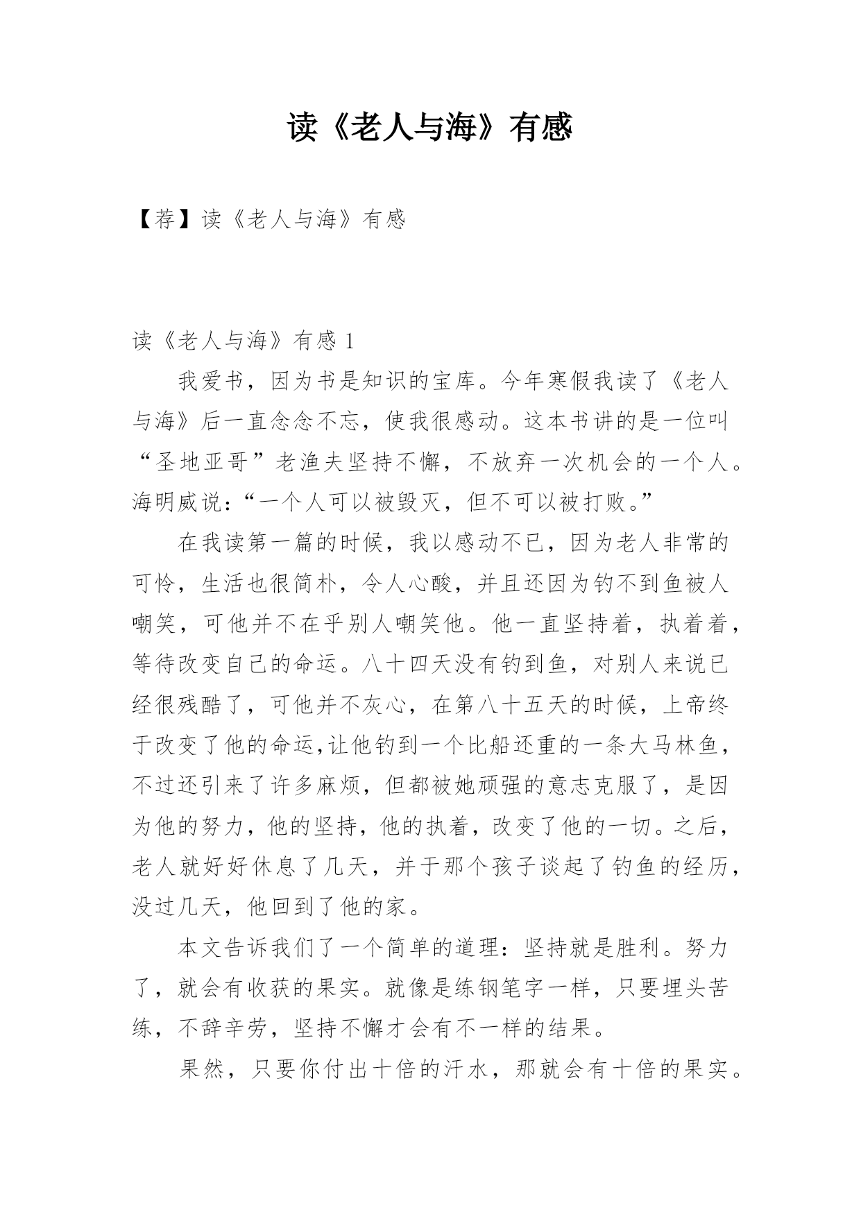 读《老人与海》有感读《老人与海》有感[合集]当品味完一本著作后,相信你一定有很多值得分享的收获,是时候抽出时间写写读后感了。是不是无从下笔、没有头绪?以下是小编为大家整理的读《老人与海》有感,仅供参考,希望能够帮助到大家。读《老人与海》有感1他是个老人,驾着条小船,独自在墨西哥湾流中打鱼故事是这么开始的。一个简单的故事,一个平凡的老人,一条普通的大马林鱼,在茫茫大海上发生了看似平凡而又不平凡的经历。生活老人是个渔夫,以鱼为生,捕猎大鱼是他的职责,即使已经八十四天没有捕到一条鱼,第八十五天,太阳照常升起,他