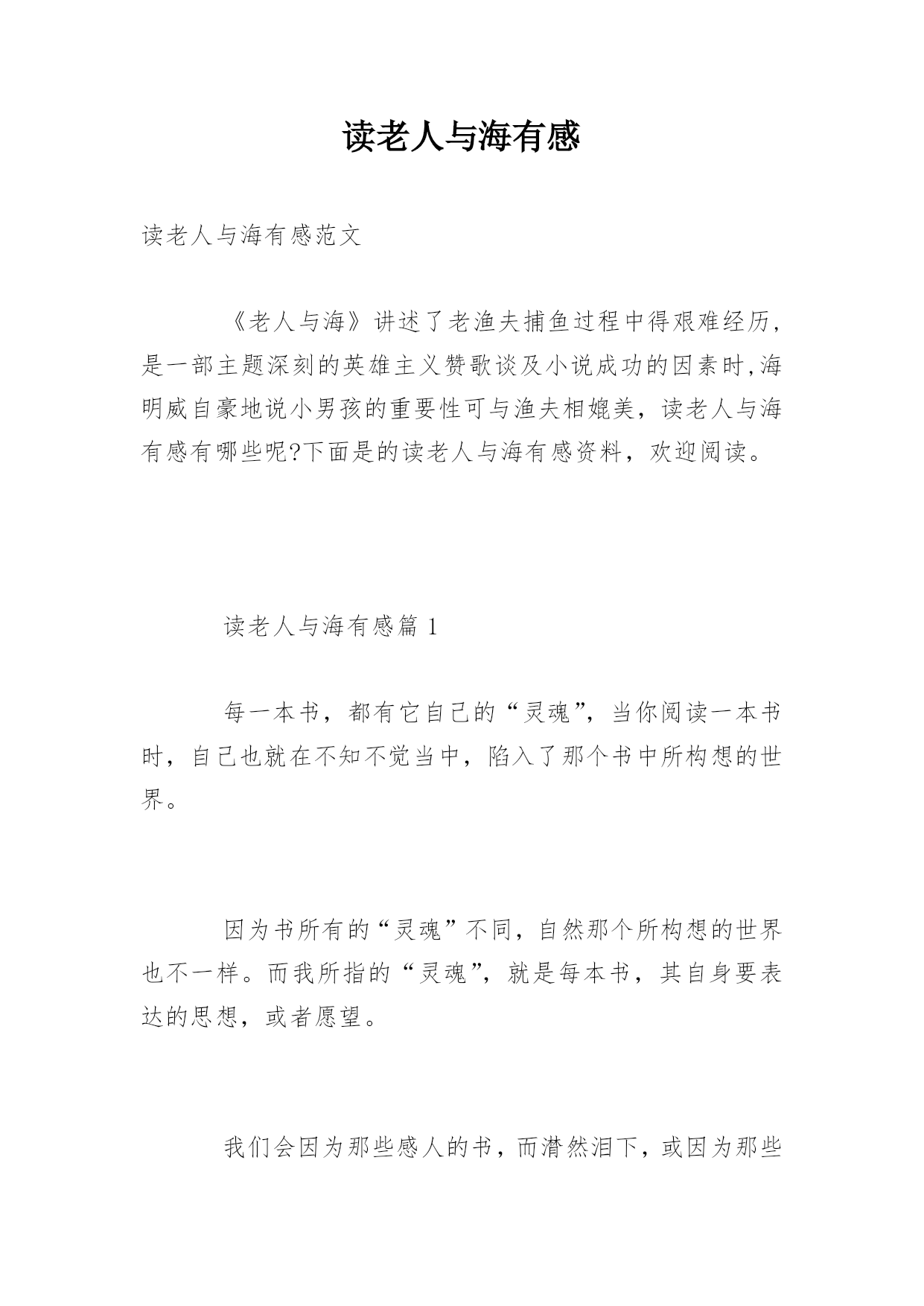 读老人与海有感读老人与海有感范文《老人与海》讲述了老渔夫捕鱼过程中得艰难经历,是一部主题深刻的英雄主义赞歌谈及小说成功的因素时,海明威自豪地说小男孩的重要性可与渔夫相媲美,读老人与海有感有哪些呢?下面是的读老人与海有感资料,欢迎阅读。读老人与海有感篇1每一本书,都有它自己的“灵魂”,当你阅读一本书时,自己也就在不知不觉当中,陷入了那个书中所构想的世界。因为书所有的“灵魂”不同,自然那个所构想的世界也不一样。而我所指的“灵魂”,就是每本书,其自身要表达的思想,或者愿望。我们会因为那些感人的书,而潸然泪下,或