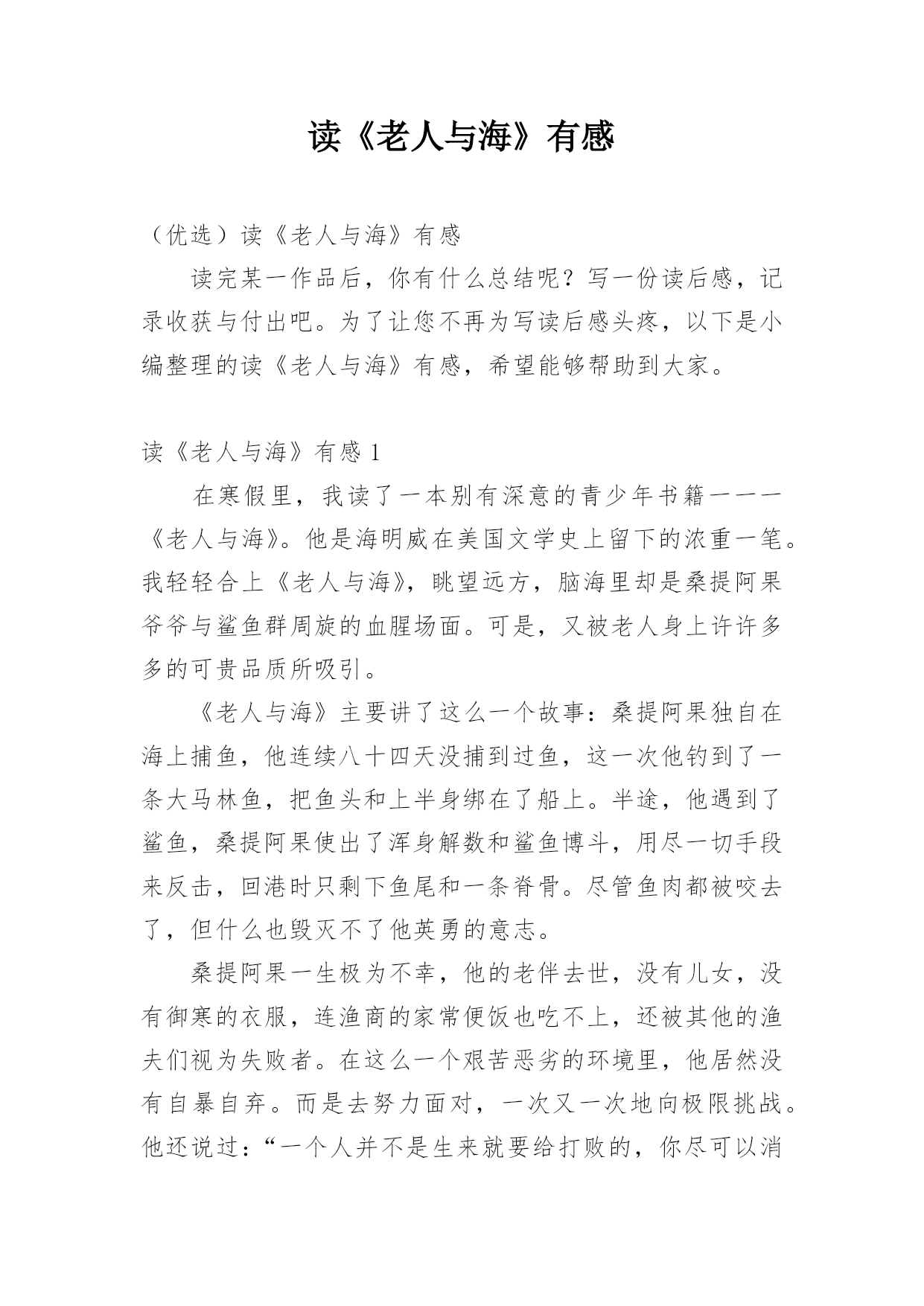 读《老人与海》有感(优选)读《老人与海》有感读完某一作品后,你有什么总结呢?写一份读后感,记录收获与付出吧。为了让您不再为写读后感头疼,以下是小编整理的读《老人与海》有感,希望能够帮助到大家。读《老人与海》有感1在寒假里,我读了一本别有深意的青少年书籍一一一《老人与海》。他是海明威在美国文学史上留下的浓重一笔。我轻轻合上《老人与海》,眺望远方,脑海里却是桑提阿果爷爷与鲨鱼群周旋的血腥场面。可是,又被老人身上许许多多的可贵品质所吸引。《老人与海》主要讲了这么一个故事:桑提阿果独自在海上捕鱼,他连续八十四天没