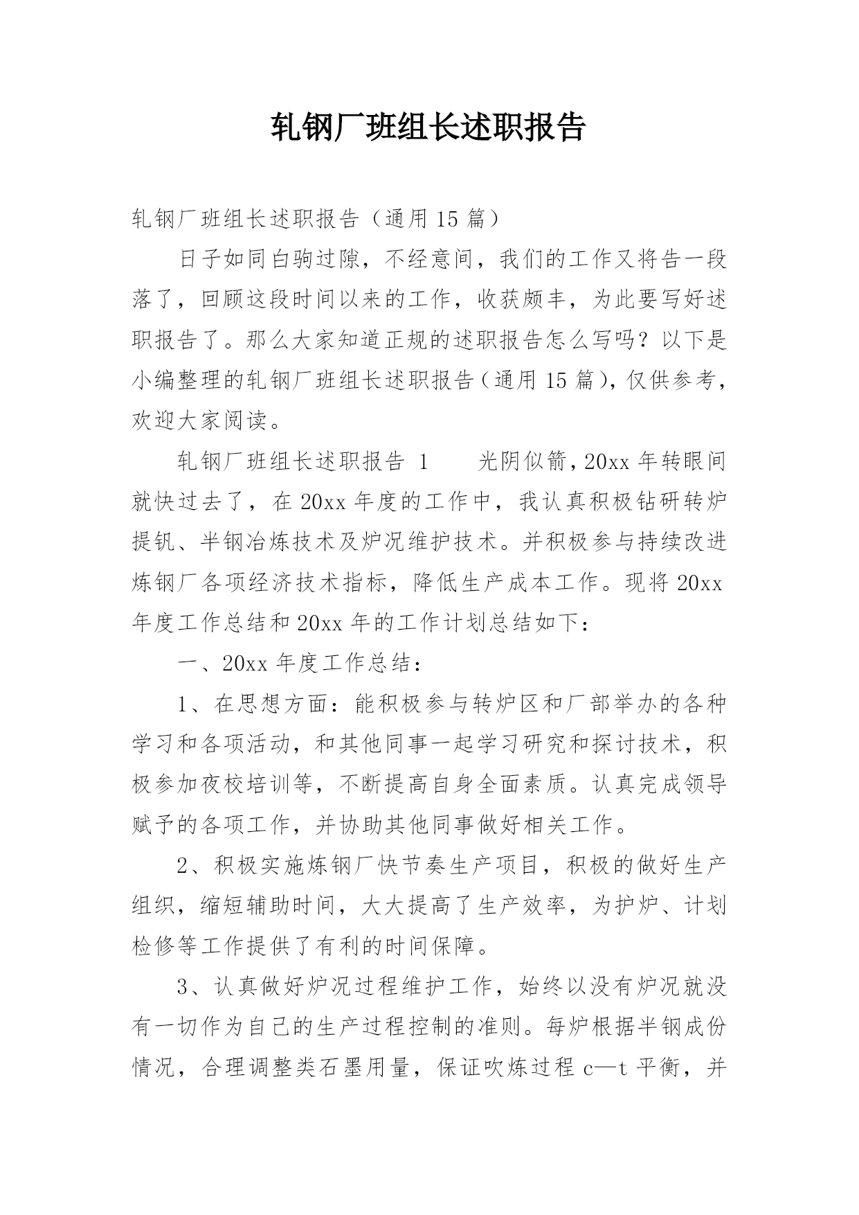 轧钢厂班组长述职报告轧钢厂班组长述职报告(通用15篇)日子如同白驹过隙,不经意间,我们的工作又将告一段落了,回顾这段时间以来的工作,收获颇丰,为此要写好述职报告了。那么大家知道正规的述职报告怎么写吗?以下是小编整理的轧钢厂班组长述职报告(通用15篇),仅供参考,欢迎大家阅读。轧钢厂班组长述职报告1光阴似箭,20xx年转眼间就快过去了,在20xx年度的工作中,我认真积极钻研转炉提钒、半钢冶炼技术及炉况维护技术。并积极参与持续改进炼钢厂各项经济技术指标,降低生产成本工作。现将20xx年度工作总结和20xx年的