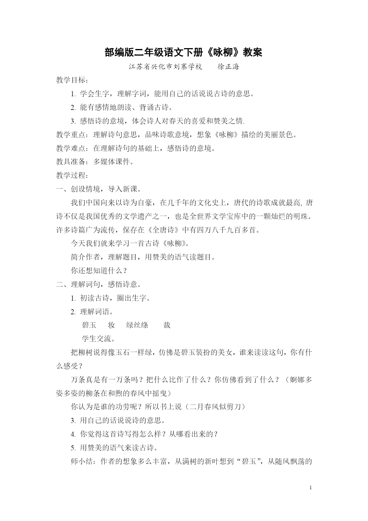 部编版二年级语文下册《咏柳》教案江苏省兴化市刘寨学校徐正海教学目标:1.学会生字,理解字词,能用自己的话说说古诗的意思。2.能有感情地朗读、背诵古诗。3.感悟诗的意境,体会诗人对春天的喜爱和赞美之情.教学重点:理解诗句意思,品味诗歌意境,想象《咏柳》描绘的美丽景色。教学难点:在理解诗句的基础上,感悟诗的意境。教具准备:多媒体课件。教学过程:一、创设情境,导入新课。我们中国向来以诗为自豪,在几千年的文化史上,唐代的诗歌成就最高,唐诗不仅是我国优秀的文学遗产之一,也是全世界文学宝
