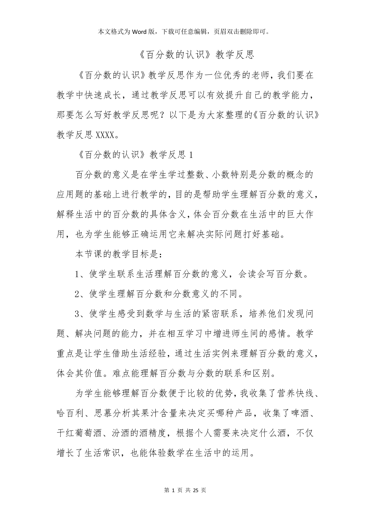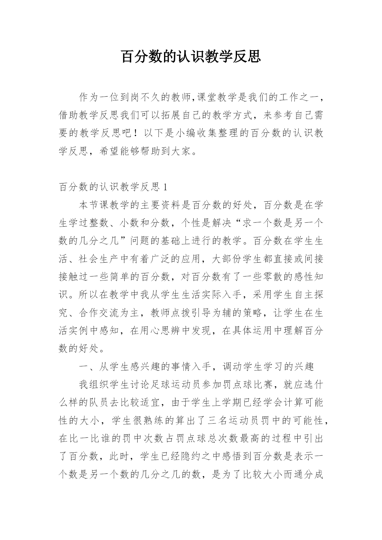 本文格式为Word版,下载可任意编辑,页眉双击删除即可。《百分数的认识》教学反思《百分数的认识》教学反思作为一位优秀的老师,我们要在教学中快速成长,通过教学反思可以有效提升自己的教学能力,那要怎么写好教学反思呢?以下是为大家整理的《百分数的认识》教学反思XXXX。《百分数的认识》教学反思1百分数的意义是在学生学过整数、小数特别是分数的概念的应用题的基础上进行教学的,目的是帮助学生理解百分数的意义,解释生活中的百分数的具体含义,体会百分数在生活中的巨大作用,也为学生能够正确运用它来解决实际问题打好基础。本节