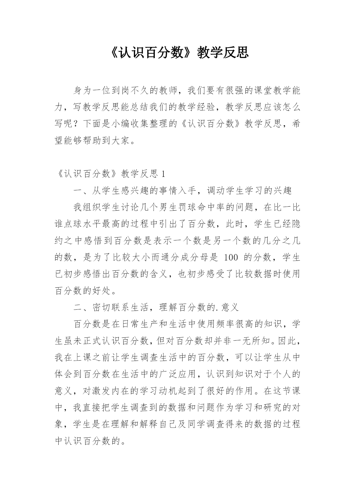 《认识百分数》教学反思身为一位到岗不久的教师,我们要有很强的课堂教学能力,写教学反思能总结我们的教学经验,教学反思应该怎么写呢?下面是小编收集整理的《认识百分数》教学反思,希望能够帮助到大家。《认识百分数》教学反思1一、从学生感兴趣的事情入手,调动学生学习的兴趣我组织学生讨论几个男生罚球命中率的问题,在比一比谁点球水平最高的过程中引出了百分数,此时,学生已经隐约之中感悟到百分数是表示一个数是另一个数的几分之几的数,是为了比较大小而通分成分母是100的分数,学生已初步感悟出百分数的含义,也初步感受了比较数据