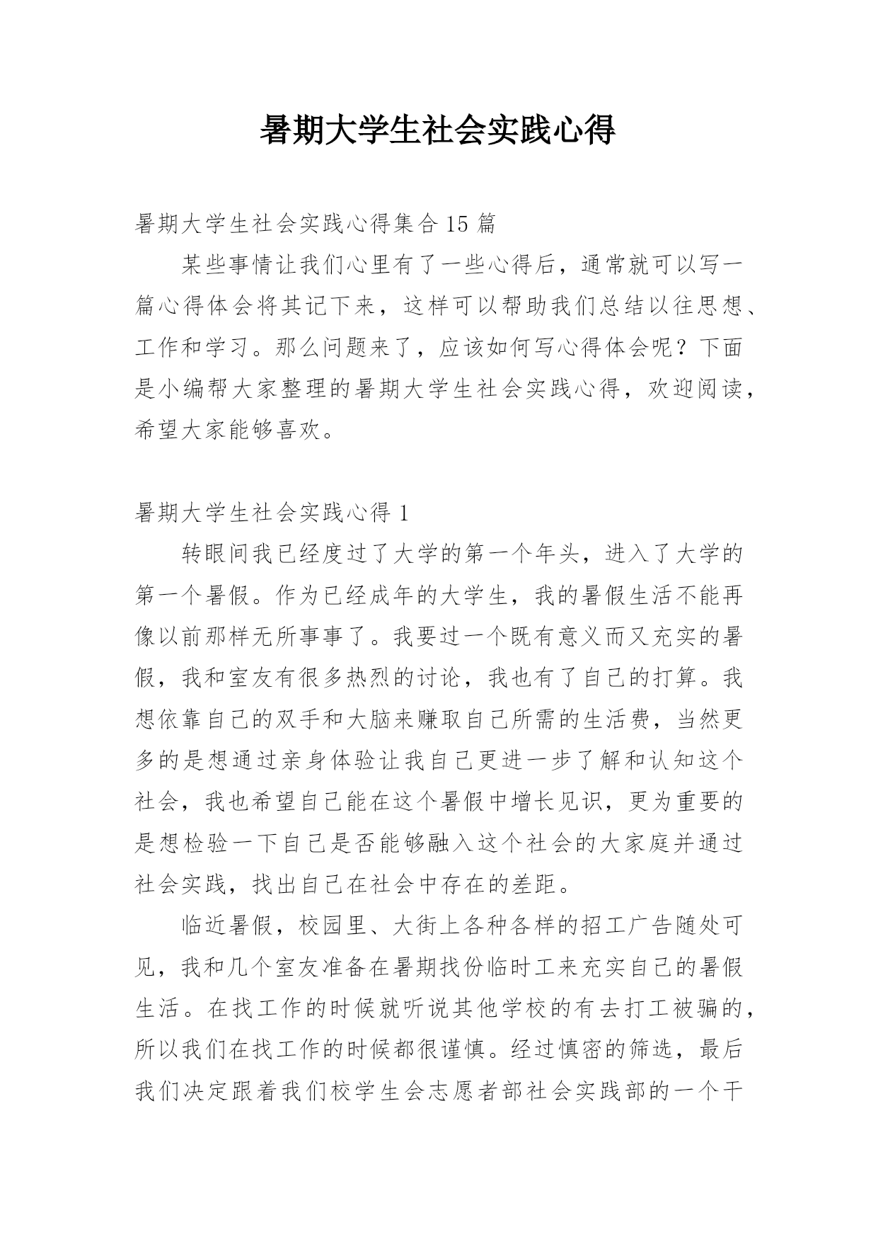 暑期大学生社会实践心得暑期大学生社会实践心得集合15篇某些事情让我们心里有了一些心得后,通常就可以写一篇心得体会将其记下来,这样可以帮助我们总结以往思想、工作和学习。那么问题来了,应该如何写心得体会呢?下面是小编帮大家整理的暑期大学生社会实践心得,欢迎阅读,希望大家能够喜欢。暑期大学生社会实践心得1转眼间我已经度过了大学的第一个年头,进入了大学的第一个暑假。作为已经成年的大学生,我的暑假生活不能再像以前那样无所事事了。我要过一个既有意义而又充实的暑假,我和室友有很多热烈的讨论,我也有了自己的打算。我想依靠