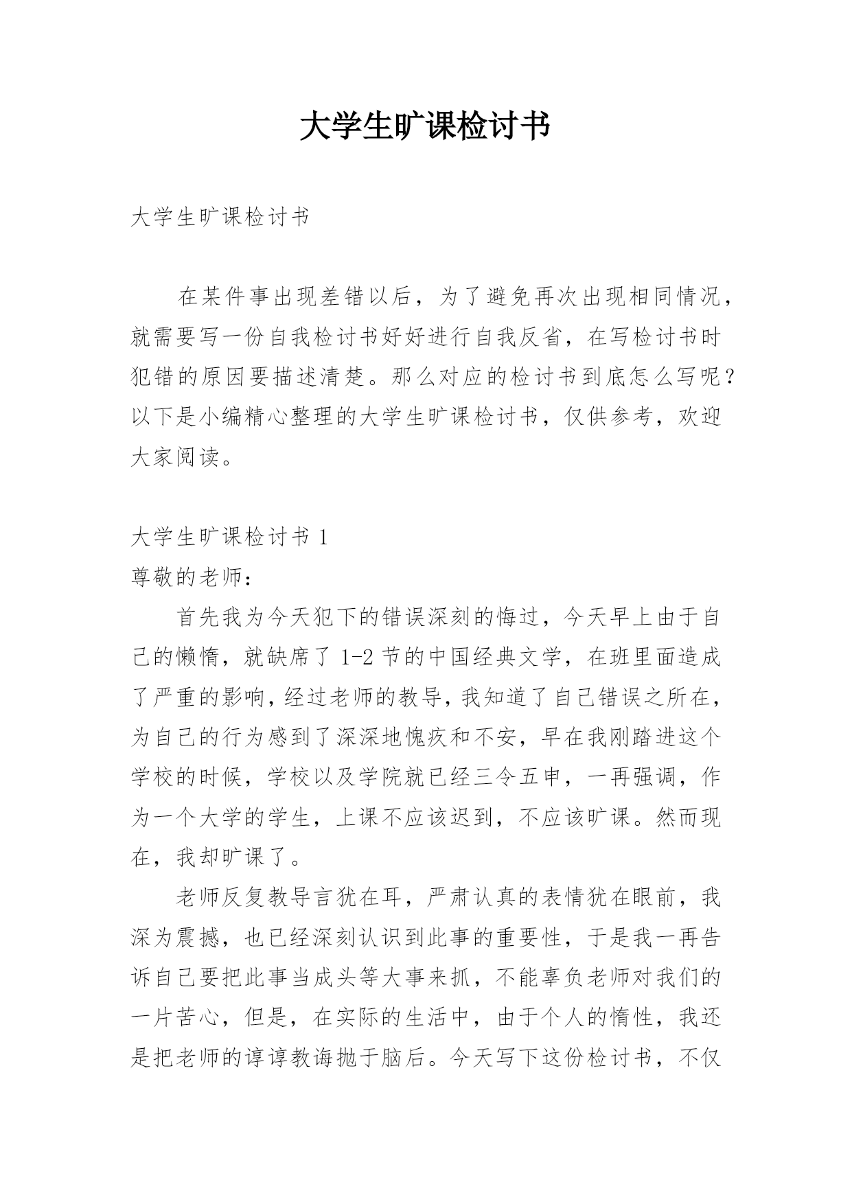 大学生旷课检讨书大学生旷课检讨书在某件事出现差错以后,为了避免再次出现相同情况,就需要写一份自我检讨书好好进行自我反省,在写检讨书时犯错的原因要描述清楚。那么对应的检讨书到底怎么写呢?以下是小编精心整理的大学生旷课检讨书,仅供参考,欢迎大家阅读。大学生旷课检讨书1尊敬的老师:首先我为今天犯下的错误深刻的悔过,今天早上由于自己的懒惰,就缺席了1-2节的中国经典文学,在班里面造成了严重的影响,经过老师的教导,我知道了自己错误之所在,为自己的行为感到了深深地愧疚和不安,早在我刚踏进这个学校的时候,学校以及学院就