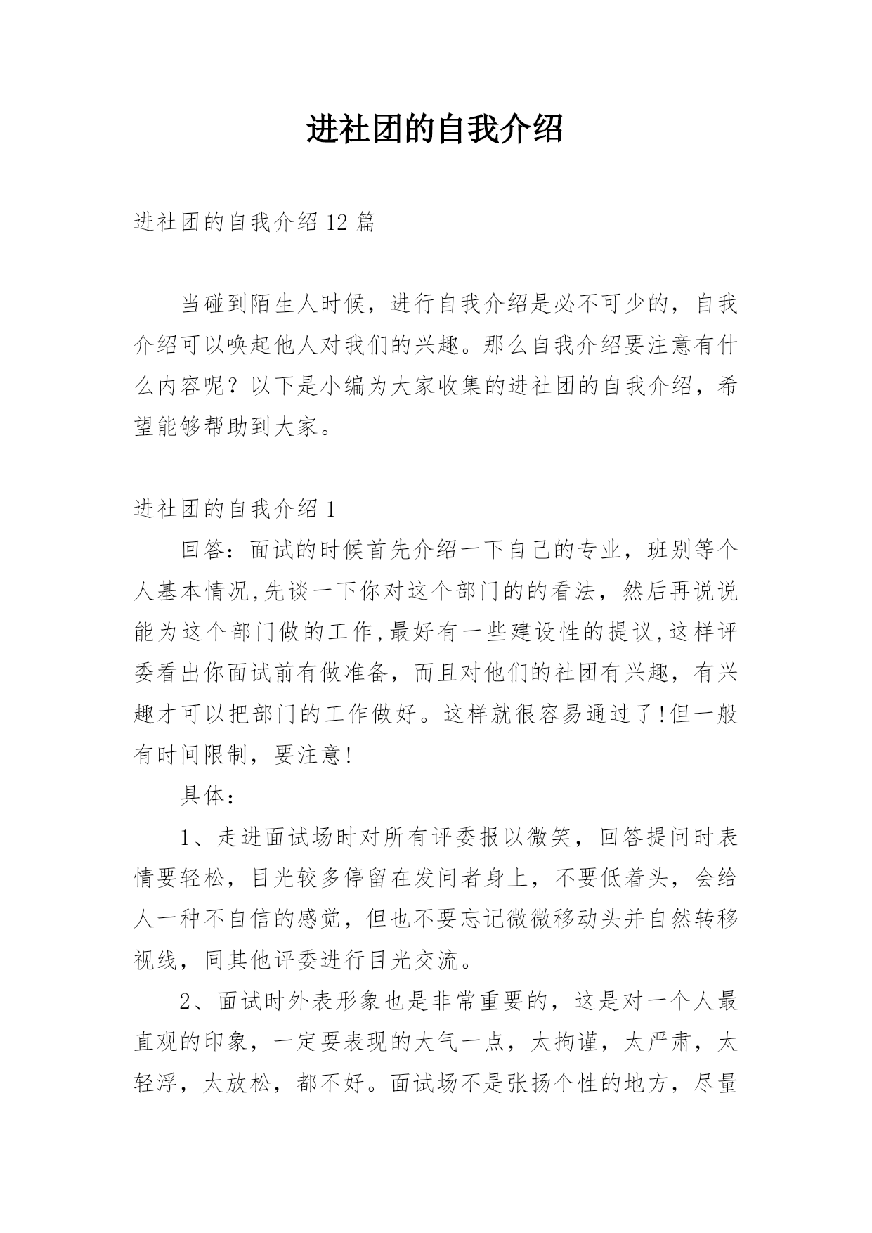 进社团的自我介绍进社团的自我介绍12篇当碰到陌生人时候,进行自我介绍是必不可少的,自我介绍可以唤起他人对我们的兴趣。那么自我介绍要注意有什么内容呢?以下是小编为大家收集的进社团的自我介绍,希望能够帮助到大家。进社团的自我介绍1回答:面试的时候首先介绍一下自己的专业,班别等个人基本情况,先谈一下你对这个部门的的看法,然后再说说能为这个部门做的工作,最好有一些建设性的提议,这样评委看出你面试前有做准备,而且对他们的社团有兴趣,有兴趣才可以把部门的工作做好。这样就很容易通过了!但一般有时间限制,要注意!具体:1