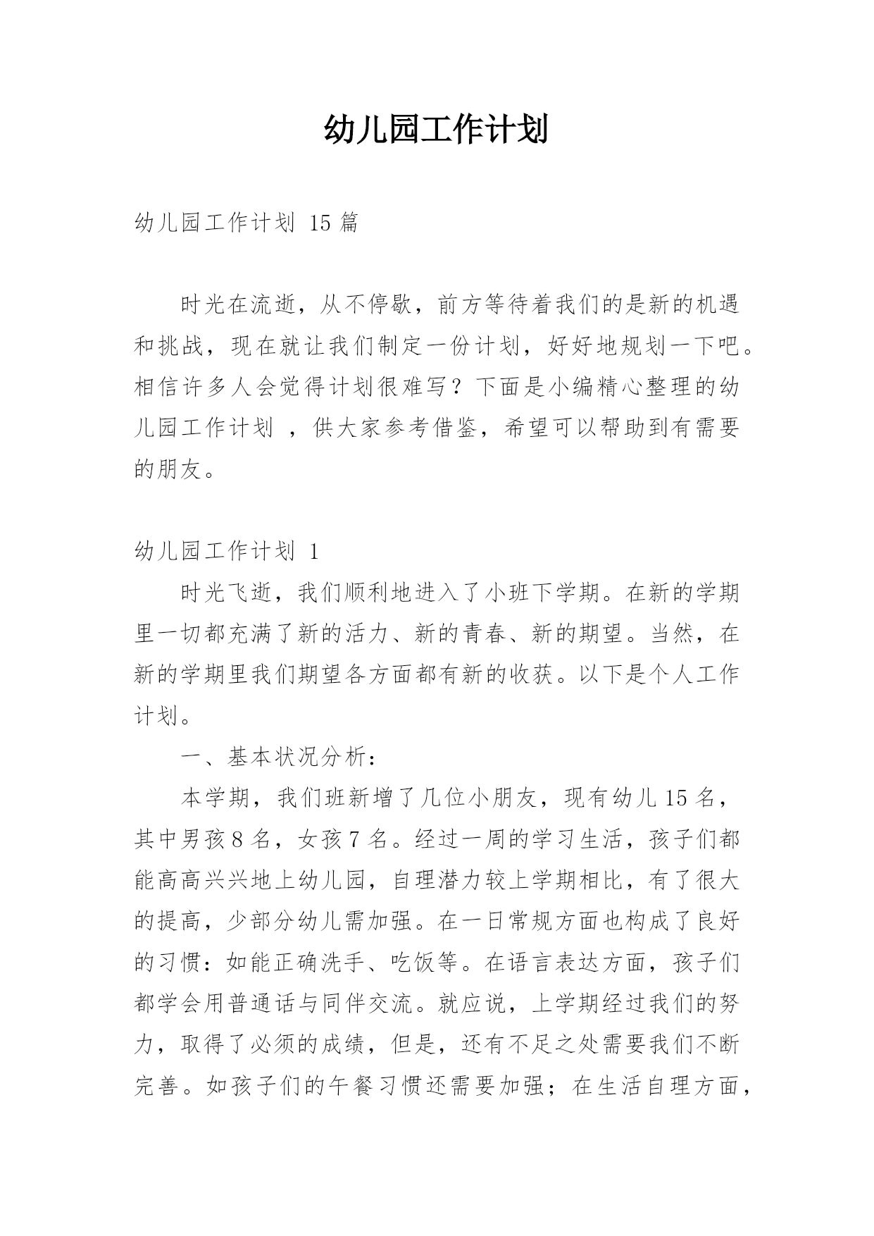 幼儿园工作计划幼儿园工作计划15篇时光在流逝,从不停歇,前方等待着我们的是新的机遇和挑战,现在就让我们制定一份计划,好好地规划一下吧。相信许多人会觉得计划很难写?下面是小编精心整理的幼儿园工作计划,供大家参考借鉴,希望可以帮助到有需要的朋友。幼儿园工作计划1时光飞逝,我们顺利地进入了小班下学期。在新的学期里一切都充满了新的活力、新的青春、新的期望。当然,在新的学期里我们期望各方面都有新的收获。以下是个人工作计划。一、基本状况分析:本学期,我们班新增了几位小朋友,现有幼儿15名,其中男孩8名,女孩7名。经过