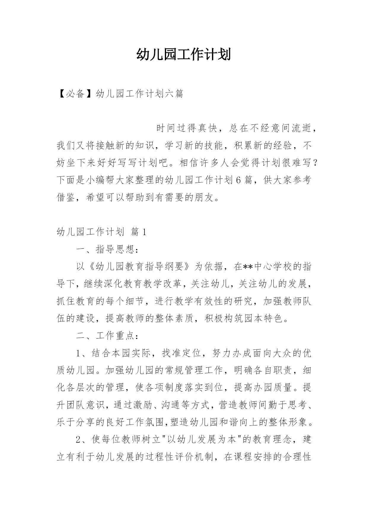 幼儿园工作计划【必备】幼儿园工作计划六篇时间过得真快,总在不经意间流逝,我们又将接触新的知识,学习新的技能,积累新的经验,不妨坐下来好好写写计划吧。相信许多人会觉得计划很难写?下面是小编帮大家整理的幼儿园工作计划6篇,供大家参考借鉴,希望可以帮助到有需要的朋友。幼儿园工作计划篇1一、指导思想:以《幼儿园教育指导纲要》为依据,在**中心学校的指导下,继续深化教育教学改革,关注幼儿,关注幼儿的发展,抓住教育的每个细节,进行教学有效性的研究,加强教师队伍的建设,提高教师的整体素质,积极构筑园本特色。二、工作重点