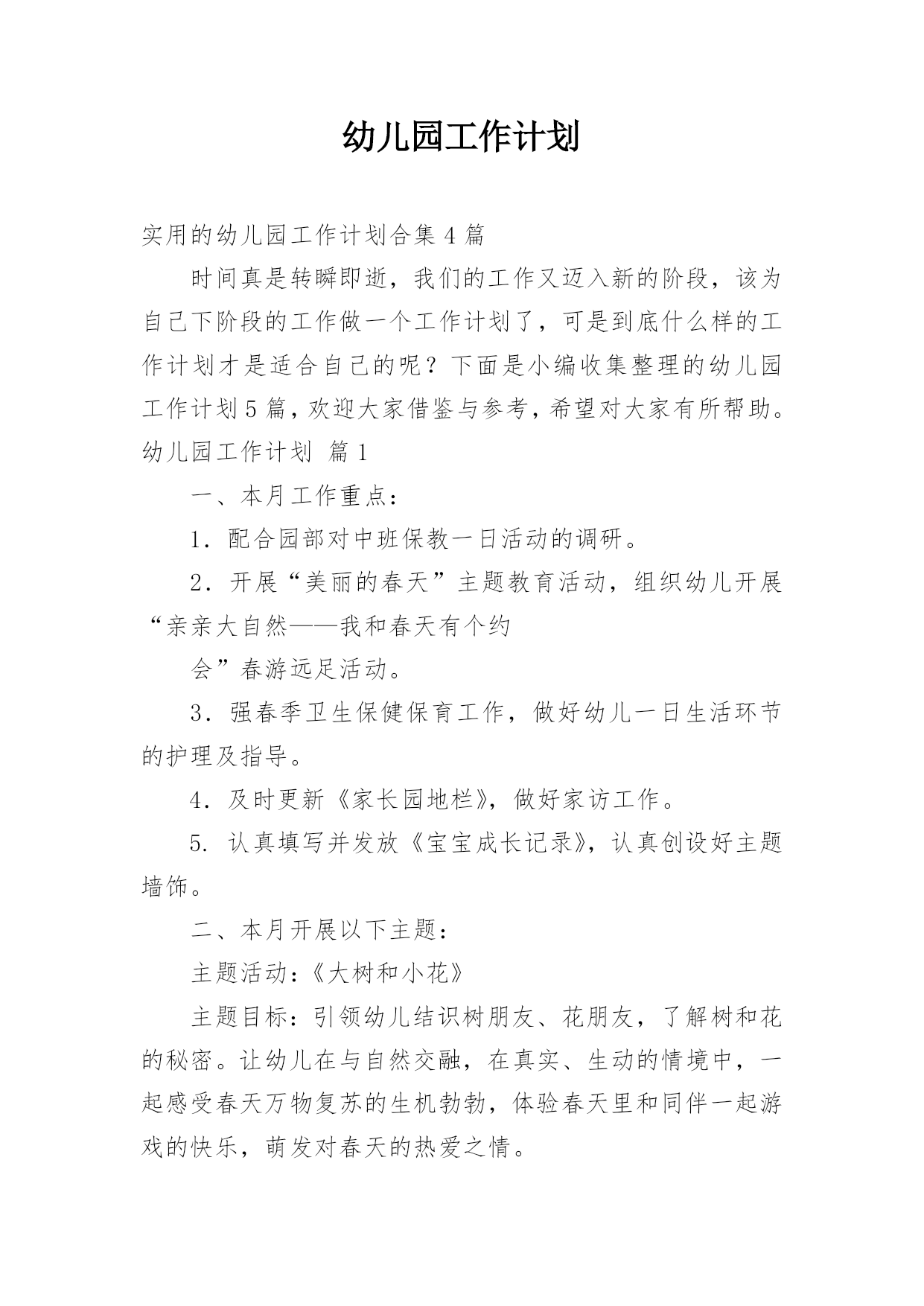 幼儿园工作计划实用的幼儿园工作计划合集4篇时间真是转瞬即逝,我们的工作又迈入新的阶段,该为自己下阶段的工作做一个工作计划了,可是到底什么样的工作计划才是适合自己的呢?下面是小编收集整理的幼儿园工作计划5篇,欢迎大家借鉴与参考,希望对大家有所帮助。幼儿园工作计划篇1一、本月工作重点:1.配合园部对中班保教一日活动的调研。2.开展“美丽的春天”主题教育活动,组织幼儿开展“亲亲大自然——我和春天有个约会”春游远足活动。3.强春季卫生保健保育工作,做好幼儿一日生活环节的护理及指导。4.及时更新《家长园地栏》,做好