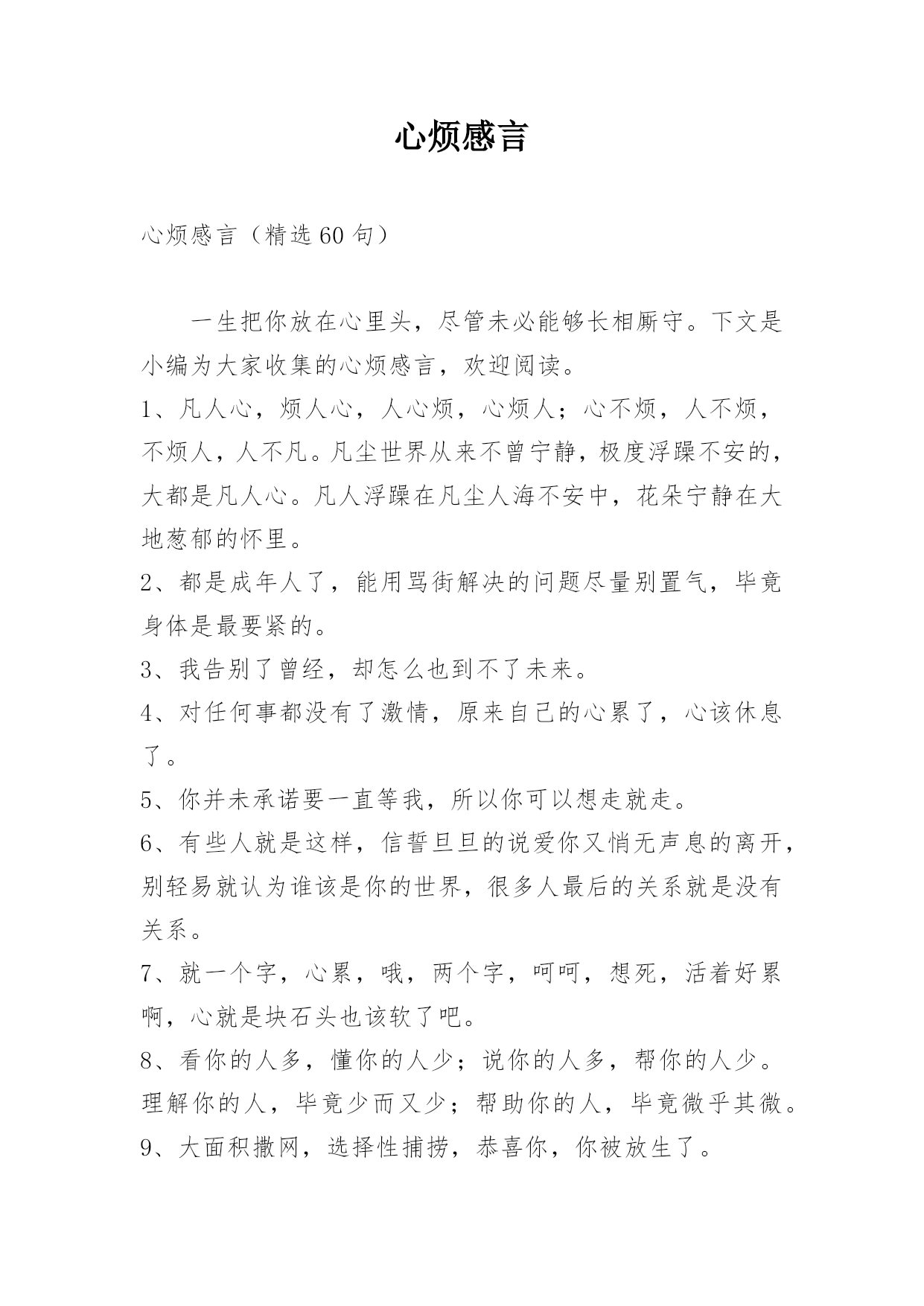 心烦感言心烦感言(精选60句)一生把你放在心里头,尽管未必能够长相厮守。下文是小编为大家收集的心烦感言,欢迎阅读。1、凡人心,烦人心,人心烦,心烦人;心不烦,人不烦,不烦人,人不凡。凡尘世界从来不曾宁静,极度浮躁不安的,大都是凡人心。凡人浮躁在凡尘人海不安中,花朵宁静在大地葱郁的怀里。2、都是成年人了,能用骂街解决的问题尽量别置气,毕竟身体是最要紧的。3、我告别了曾经,却怎么也到不了未来。4、对任何事都没有了激情,原来自己的心累了,心该休息了。5、你并未承诺要一直等我,所以你可以想走就走。6、有些人就是这