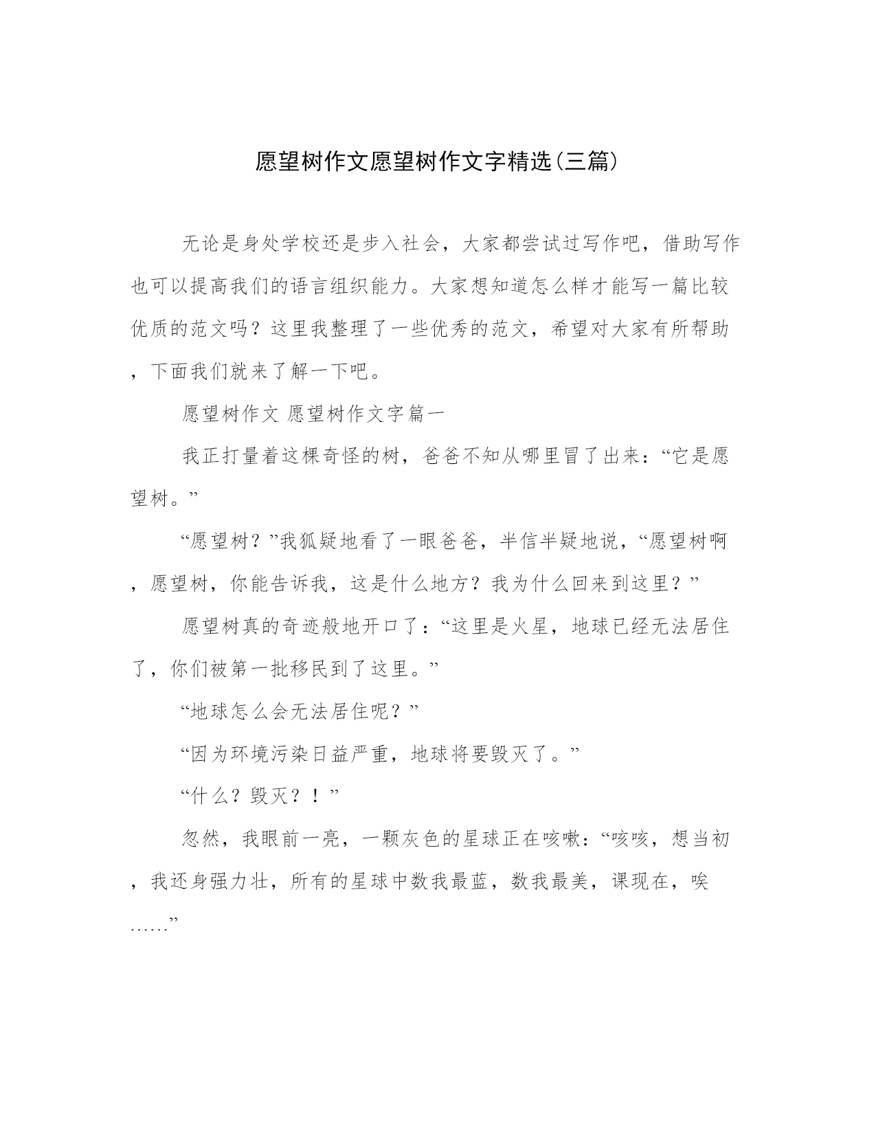 愿望树作文愿望树作文字精选(三篇)无论是身处学校还是步入社会,大家都尝试过写作吧,借助写作也可以提高我们的语言组织能力。大家想知道怎么样才能写一篇比较优质的范文吗?这里我整理了一些优秀的范文,希望对大家有所帮助,下面我们就来了解一下吧。愿望树作文愿望树作文字篇一我正打量着这棵奇怪的树,爸爸不知从哪里冒了出来:“它是愿望树。”“愿望树?”我狐疑地看了一眼爸爸,半信半疑地说,“愿望树啊,愿望树,你能告诉我,这是什么地方?我为什么回来到这里?”愿望树真的奇迹般地开口了:“这里是火星,地球已经无法居住了,你们被第