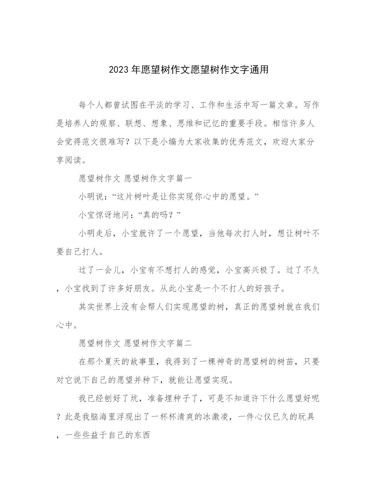 2023年愿望树作文愿望树作文字通用每个人都曾试图在平淡的学习、工作和生活中写一篇文章。写作是培养人的观察、联想、想象、思维和记忆的重要手段。相信许多人会觉得范文很难写?以下是小编为大家收集的优秀范文,欢迎大家分享阅读。愿望树作文愿望树作文字篇一小明说:“这片树叶是让你实现你心中的愿望。”小宝惊讶地问:“真的吗?”小明走后,小宝就许了一个愿望,当他每次打人时,想让树叶不要自己打人。过了一会儿,小宝有不想打人的感觉,小宝高兴极了。过了不久,小宝找到了许多好朋友。从此小宝是一个不打人的好孩子。其实世界上没有会
