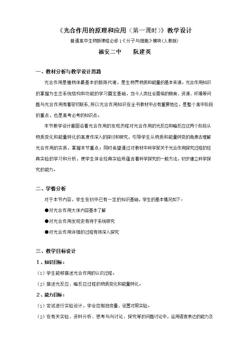《光合作用的原理和应用(第一课时)》教学设计普通高中生物新课程必修1《分子与细胞》模块(人教版)福安二中阮建英一、教材分析与教学设计思路光合作用是植物体最基本的新陈代谢,是生物界物质和能量的基本来源。光合作用知识的掌握为生态系统结构和功能的学习奠定基础,当今人类社会面临的粮食、资源、环境等问题与光合作用有着密切联系,所以光合作用知识在全书教材中占有重要地位,是整个高中阶段的重点,也是高考必考的知识点。本节教学设计意图沿着光合作用的发现历程对光合作用的光反应和暗反应这两个阶段从物质变化和能量转化的高度作深入