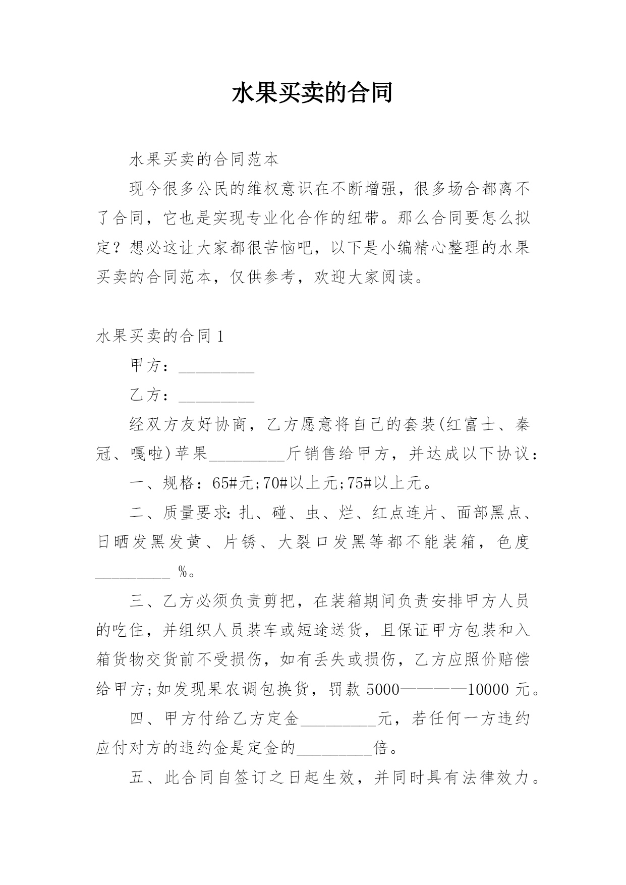 水果买卖的合同水果买卖的合同范本现今很多公民的维权意识在不断增强,很多场合都离不了合同,它也是实现专业化合作的纽带。那么合同要怎么拟定?想必这让大家都很苦恼吧,以下是小编精心整理的水果买卖的合同范本,仅供参考,欢迎大家阅读。水果买卖的合同1甲方:_________乙方:_________经双方友好协商,乙方愿意将自己的套装(红富士、秦冠、嘎啦)苹果_________斤销售给甲方,并达成以下协议:一、规格:65#元;70#以上元;75#以上元。二、质量要求:扎、碰、虫、烂、红点连片、面部黑点、日晒发黑发黄、