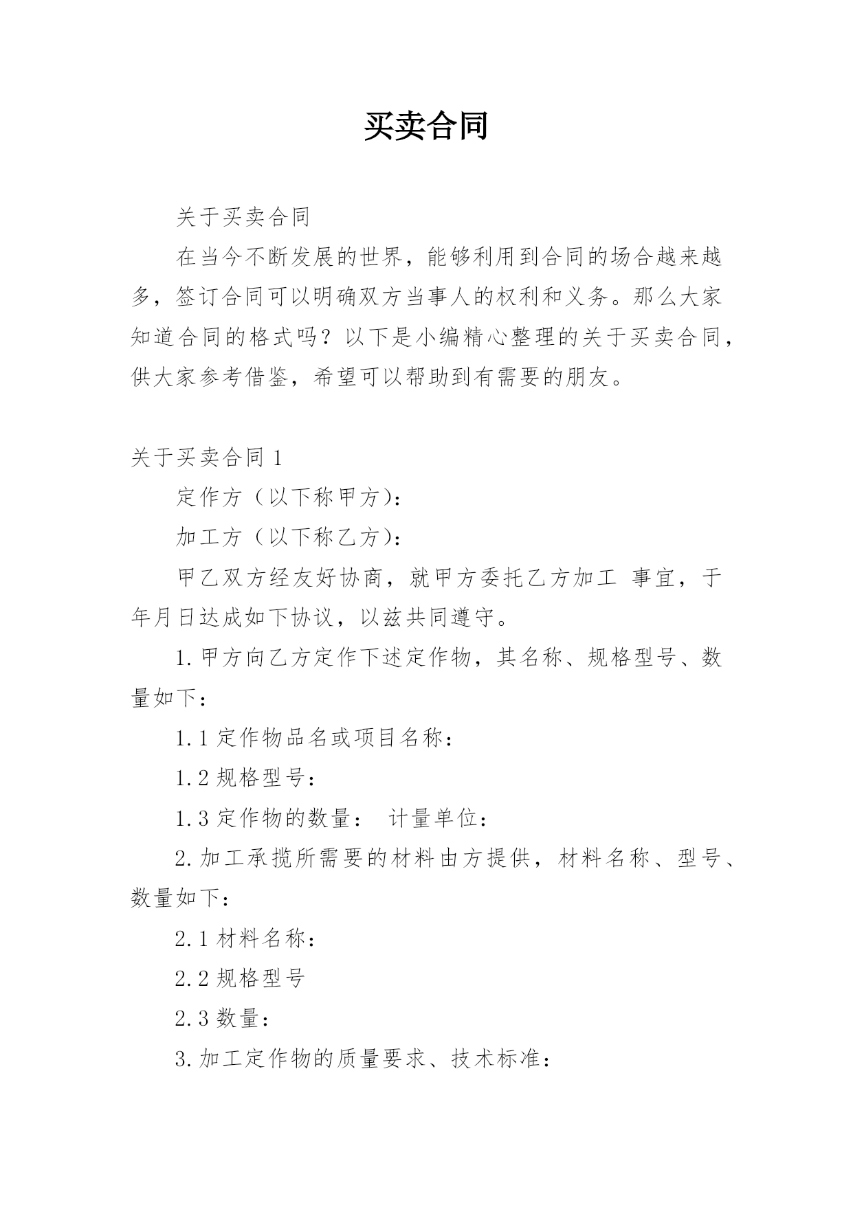 买卖合同关于买卖合同在当今不断发展的世界,能够利用到合同的场合越来越多,签订合同可以明确双方当事人的权利和义务。那么大家知道合同的格式吗?以下是小编精心整理的关于买卖合同,供大家参考借鉴,希望可以帮助到有需要的朋友。关于买卖合同1定作方(以下称甲方):加工方(以下称乙方):甲乙双方经友好协商,就甲方委托乙方加工事宜,于年月日达成如下协议,以兹共同遵守。1.甲方向乙方定作下述定作物,其名称、规格型号、数量如下:1.1定作物品名或项目名称:1.2规格型号:1.3定作物的数量:计量单位:2.加工承揽所需要的材料
