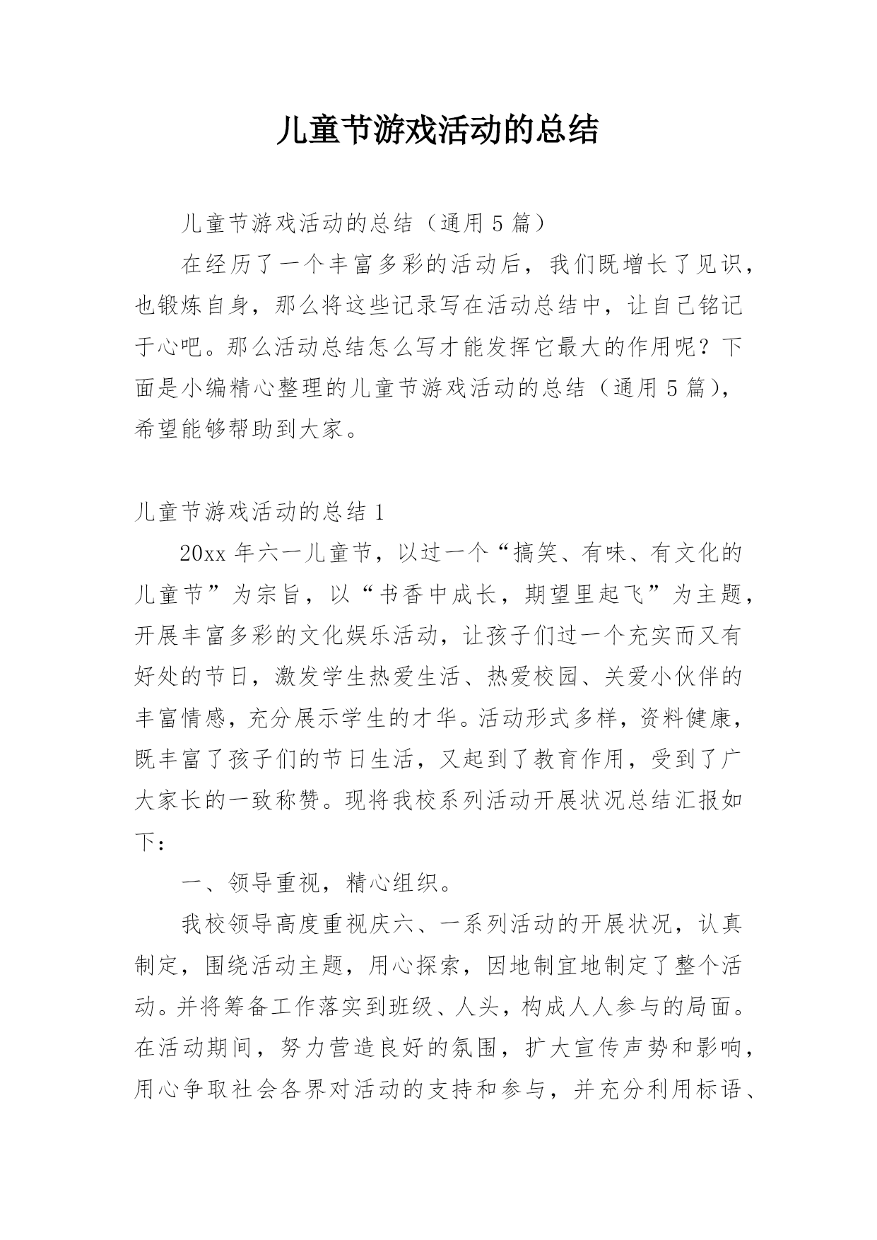 儿童节游戏活动总结儿童节游戏活动总结总结是指社会团体、企业单位和个人对某一阶段的学习、工作或其完成情况加以回顾和分析,得出教训和一些规律性认识的一种书面材料,它是增长才干的一种好办法,不如立即行动起来写一份总结吧。那么总结有什么格式呢?以下是小编精心整理的儿童节游戏活动总结,仅供参考,希望能够帮助到大家。儿童节游戏活动总结1迎着6月明媚的阳光,我园全体师生怀着愉快的心情,迎来了又一个“六一”国际儿童节。六月一日上午,幼儿园里人头涌涌,欢声笑语不断,孩子和他们的爸爸妈妈在这里度过了快乐的节日时光。现将我班六
