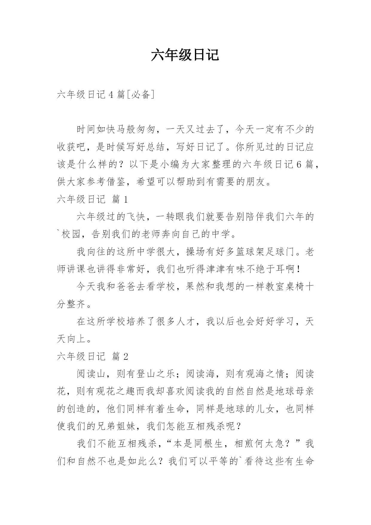 六年级日记六年级日记4篇[必备]时间如快马般匆匆,一天又过去了,今天一定有不少的收获吧,是时候写好总结,写好日记了。你所见过的日记应该是什么样的?以下是小编为大家整理的六年级日记6篇,供大家参考借鉴,希望可以帮助到有需要的朋友。六年级日记篇1六年级过的飞快,一转眼我们就要告别陪伴我们六年的`校园,告别我们的老师奔向自己的中学。我向往的这所中学很大,操场有好多篮球架足球门。老师讲课也讲得非常好,我们也听得津津有味不绝于耳啊!今天我和爸爸去看学校,果然和我想的一样教室桌椅十分整齐。在这所学校培养了很多人才,我