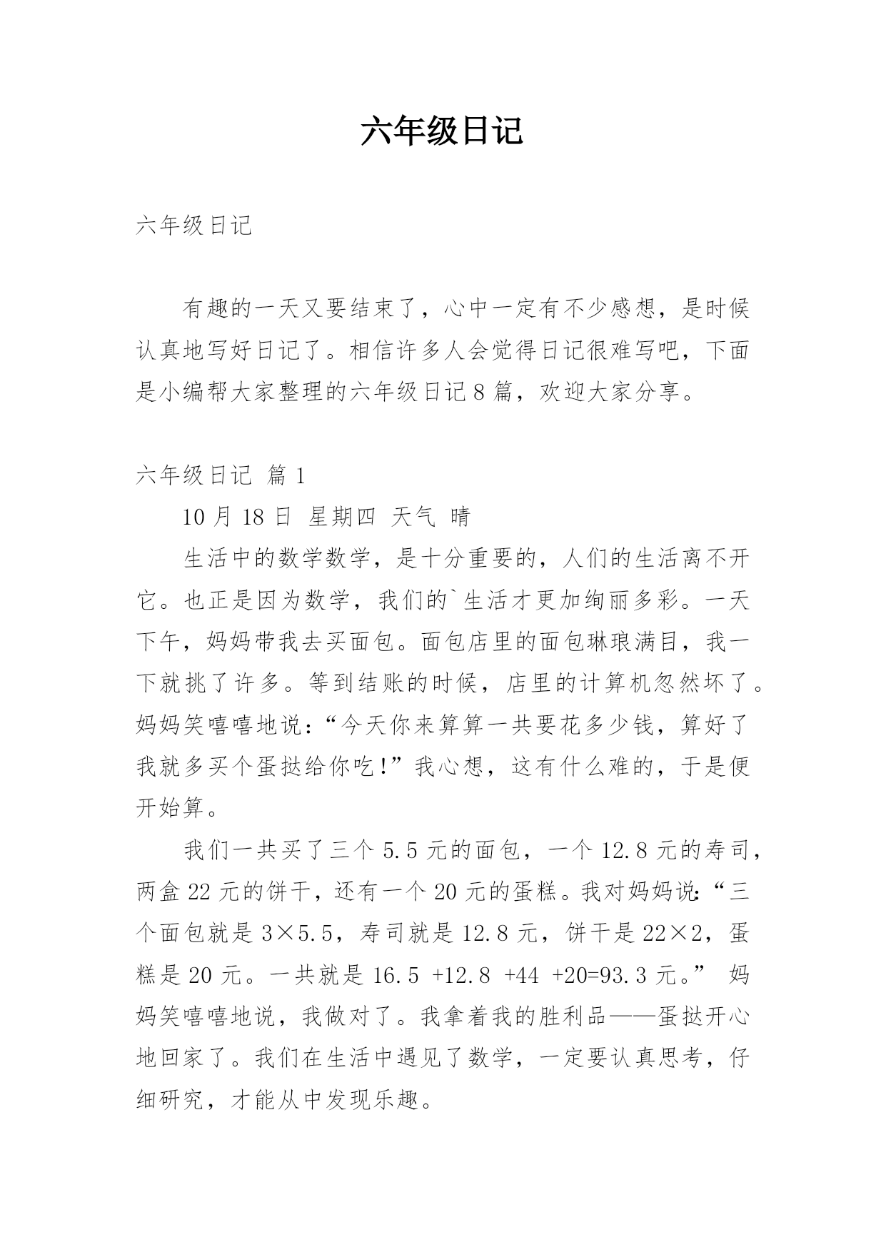 六年级日记六年级日记有趣的一天又要结束了,心中一定有不少感想,是时候认真地写好日记了。相信许多人会觉得日记很难写吧,下面是小编帮大家整理的六年级日记8篇,欢迎大家分享。六年级日记篇110月18日星期四天气晴生活中的数学数学,是十分重要的,人们的生活离不开它。也正是因为数学,我们的`生活才更加绚丽多彩。一天下午,妈妈带我去买面包。面包店里的面包琳琅满目,我一下就挑了许多。等到结账的时候,店里的计算机忽然坏了。妈妈笑嘻嘻地说:“今天你来算算一共要花多少钱,算好了我就多买个蛋挞给你吃!”我心想,这有什么难的,于